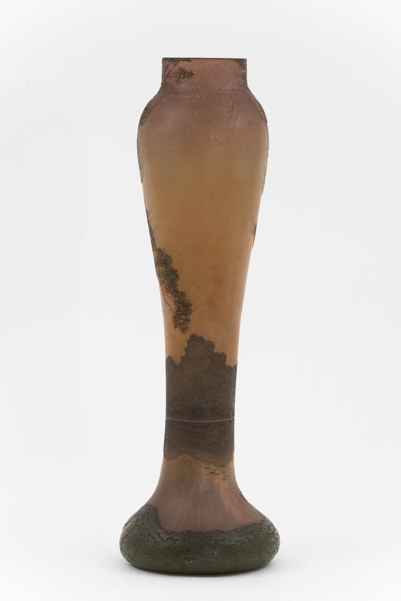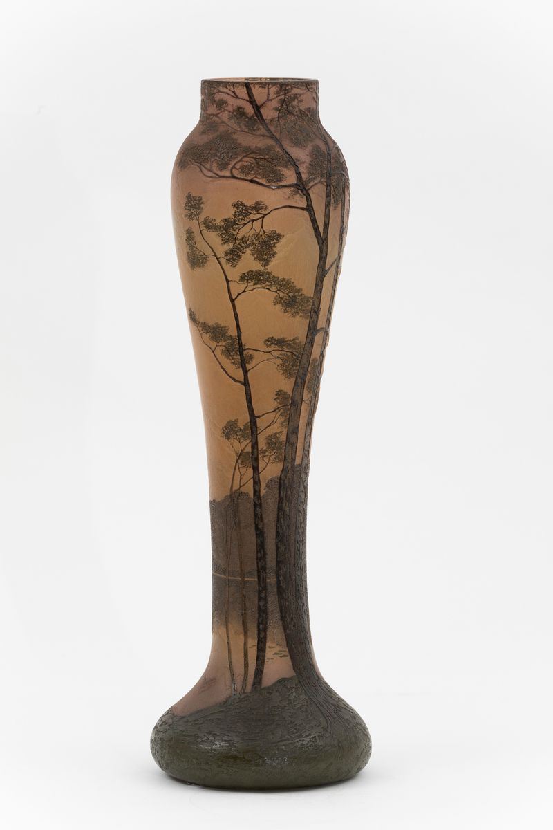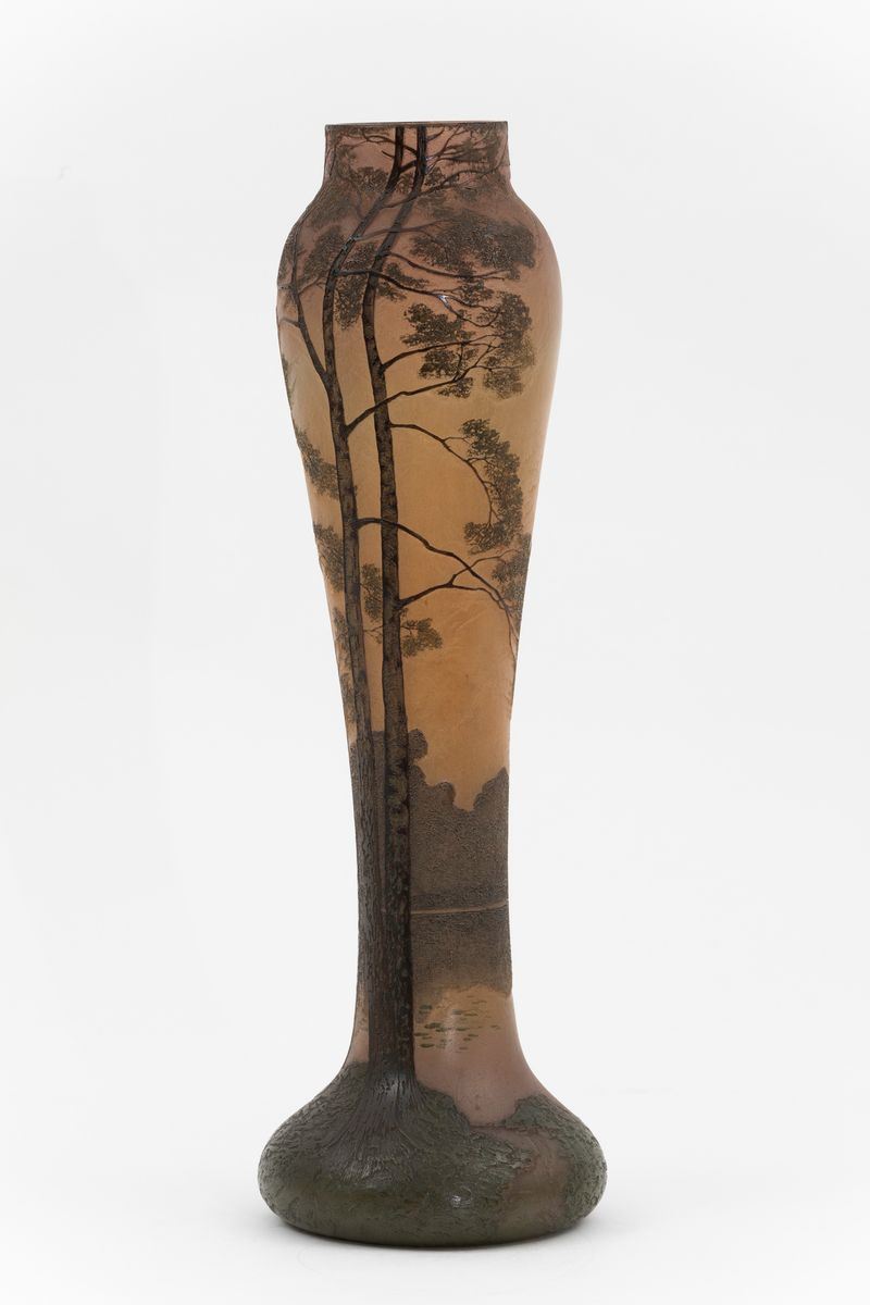 Grande vaso in vetro a cammeo con decoro di paesaggio a smalti policromi.