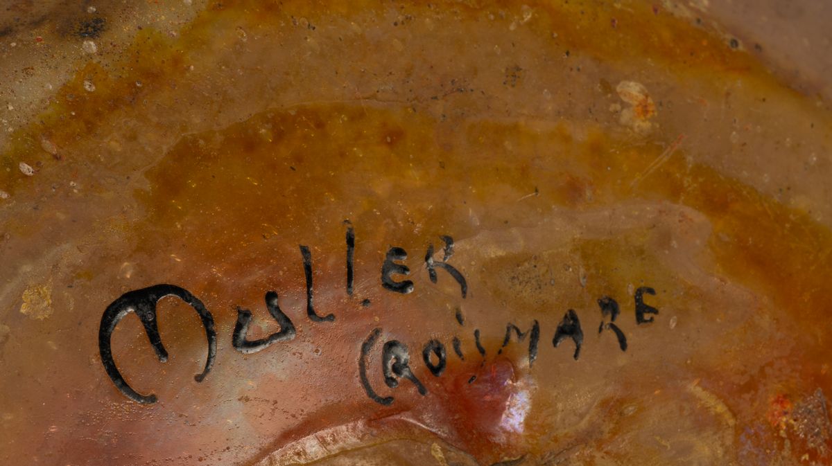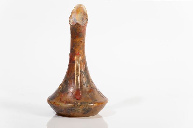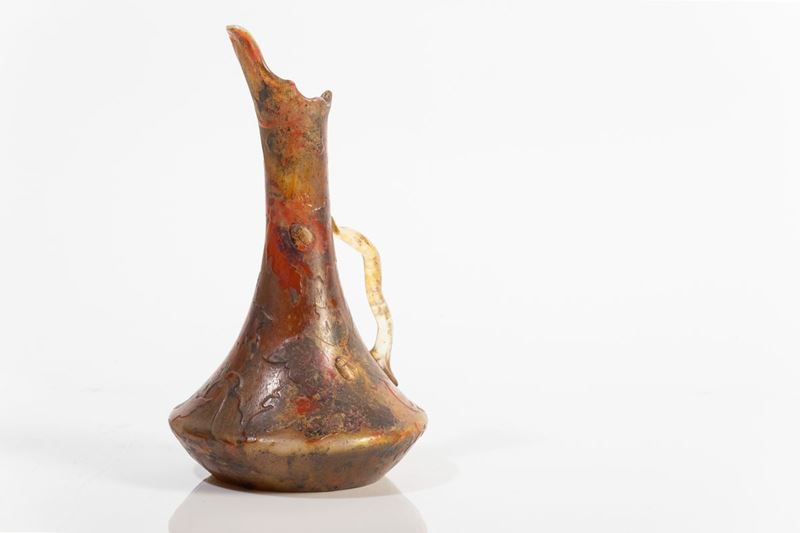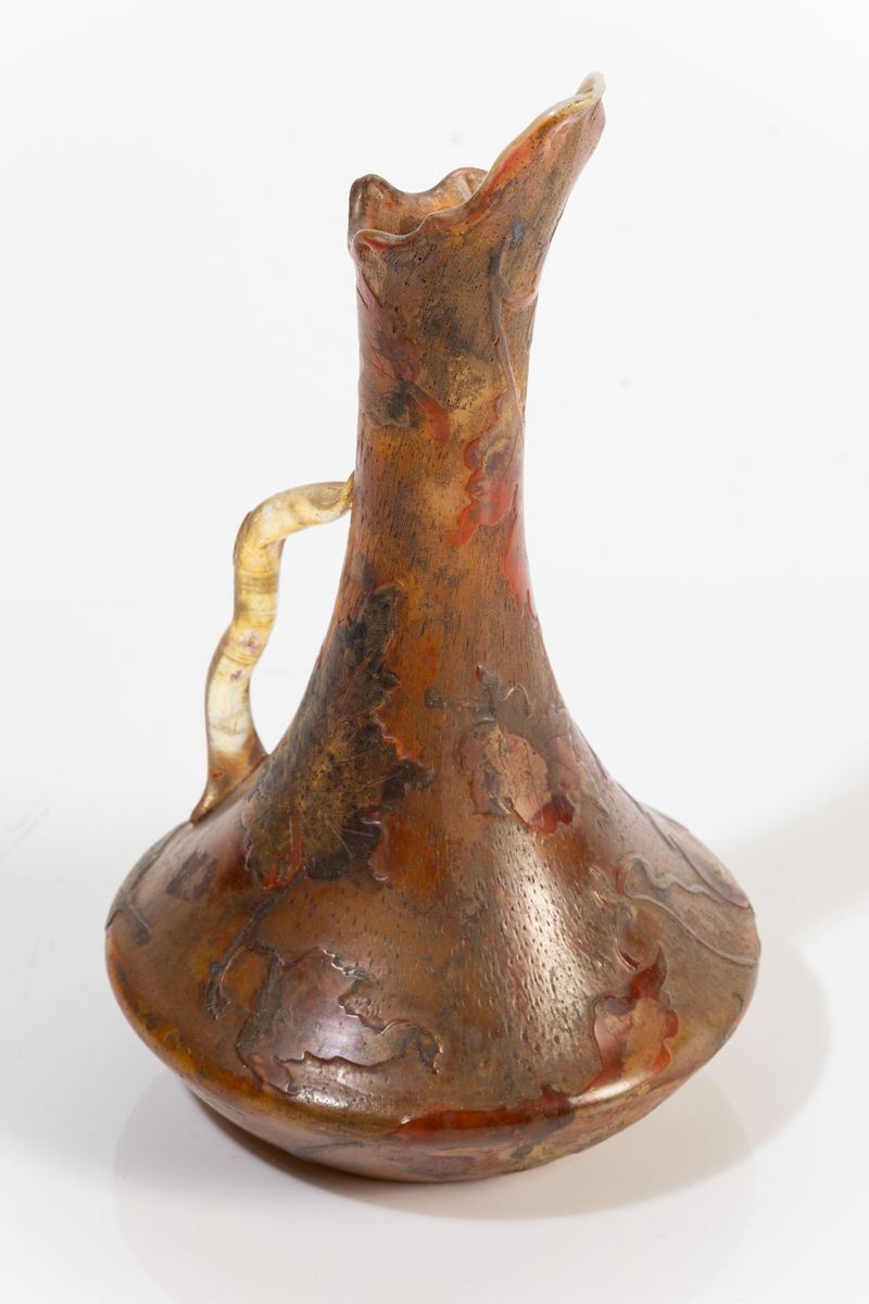 Vaso a caraffa in vetro soffiato a cammeo con decoro di foglie di vite e ansa applicata.