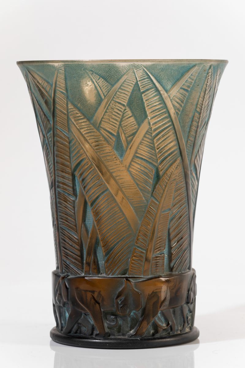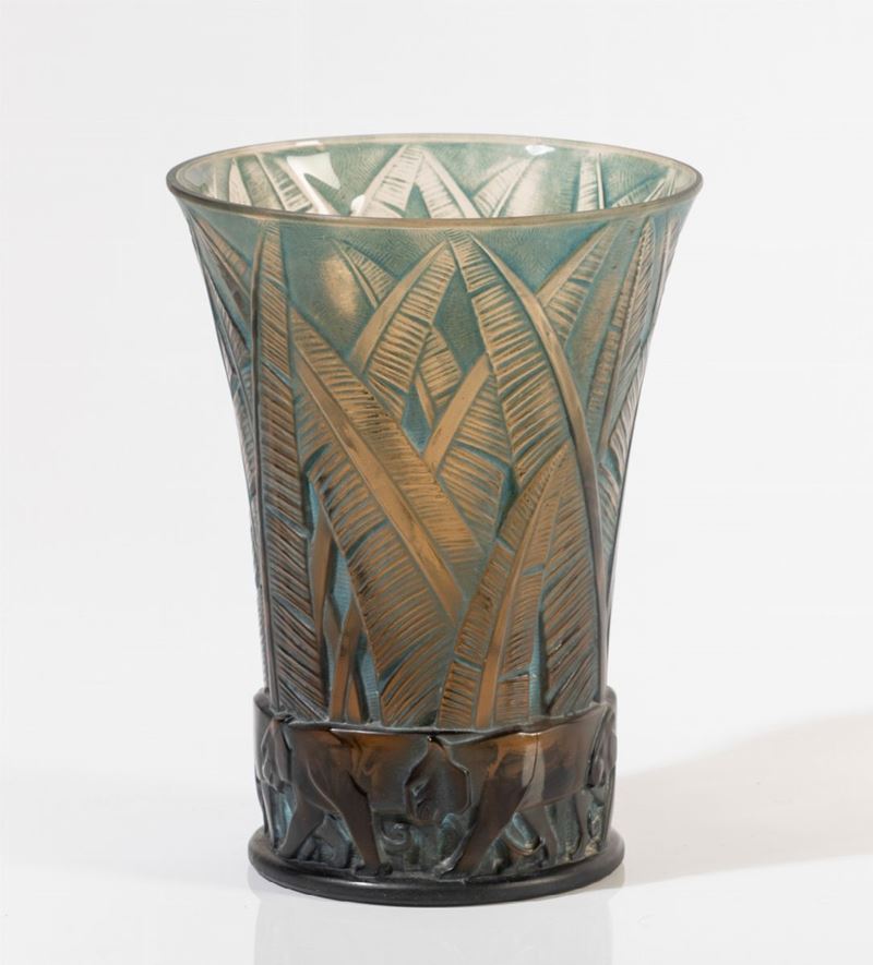 Vaso troncoconico in vetro soffiato a stampo con decoro a rilievo di jungla e tigri.