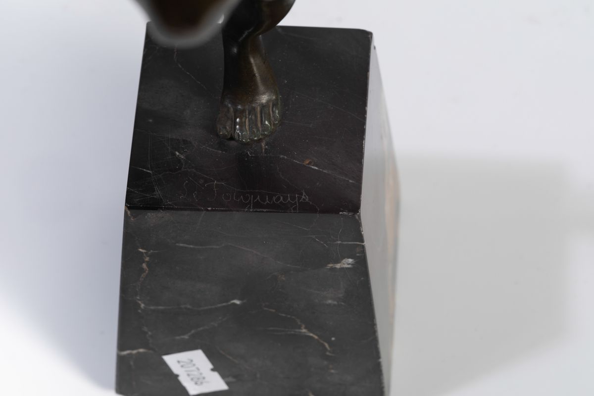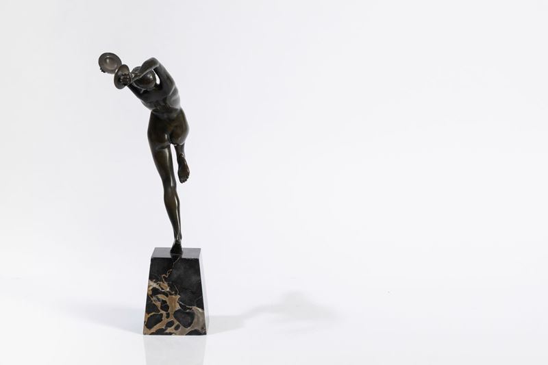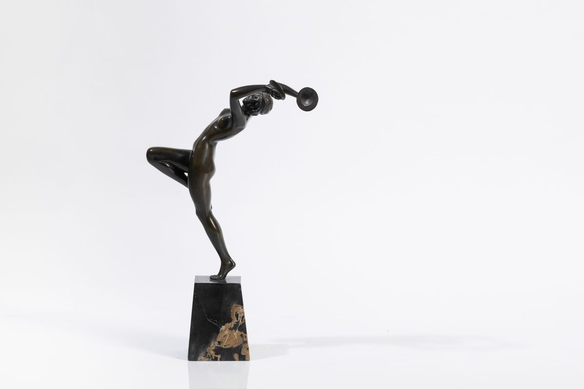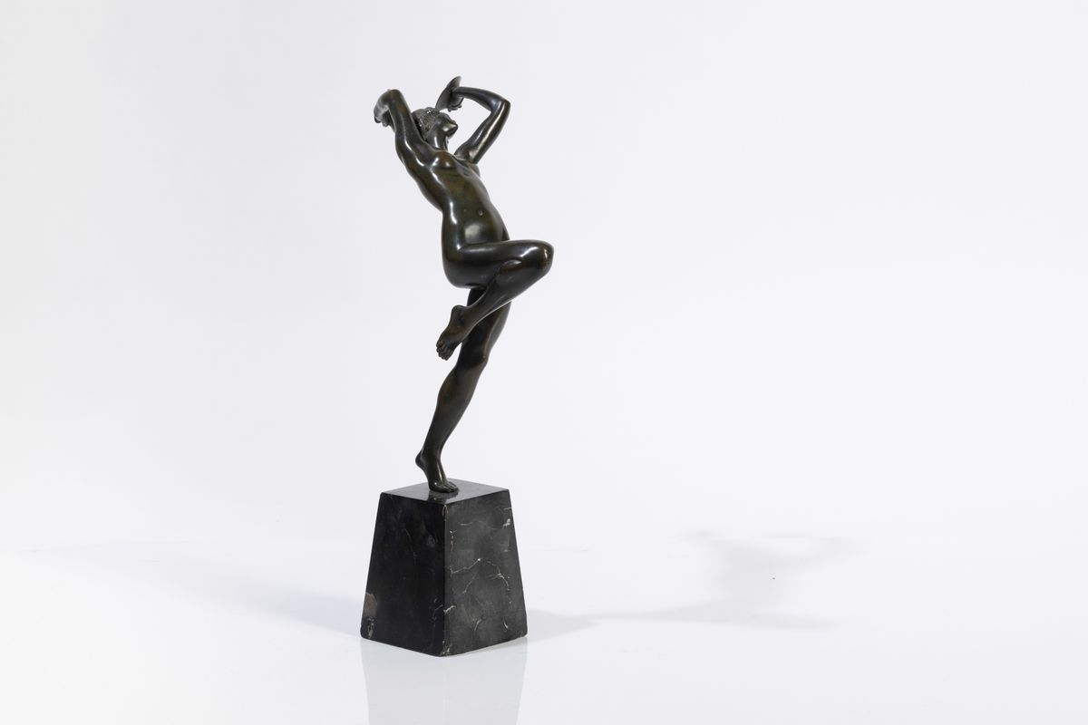 Scultura in bronzo di donna con tamburello su basamento in marmo Portoro.