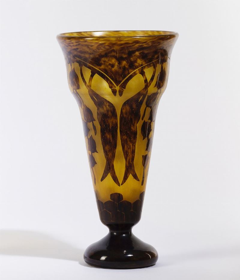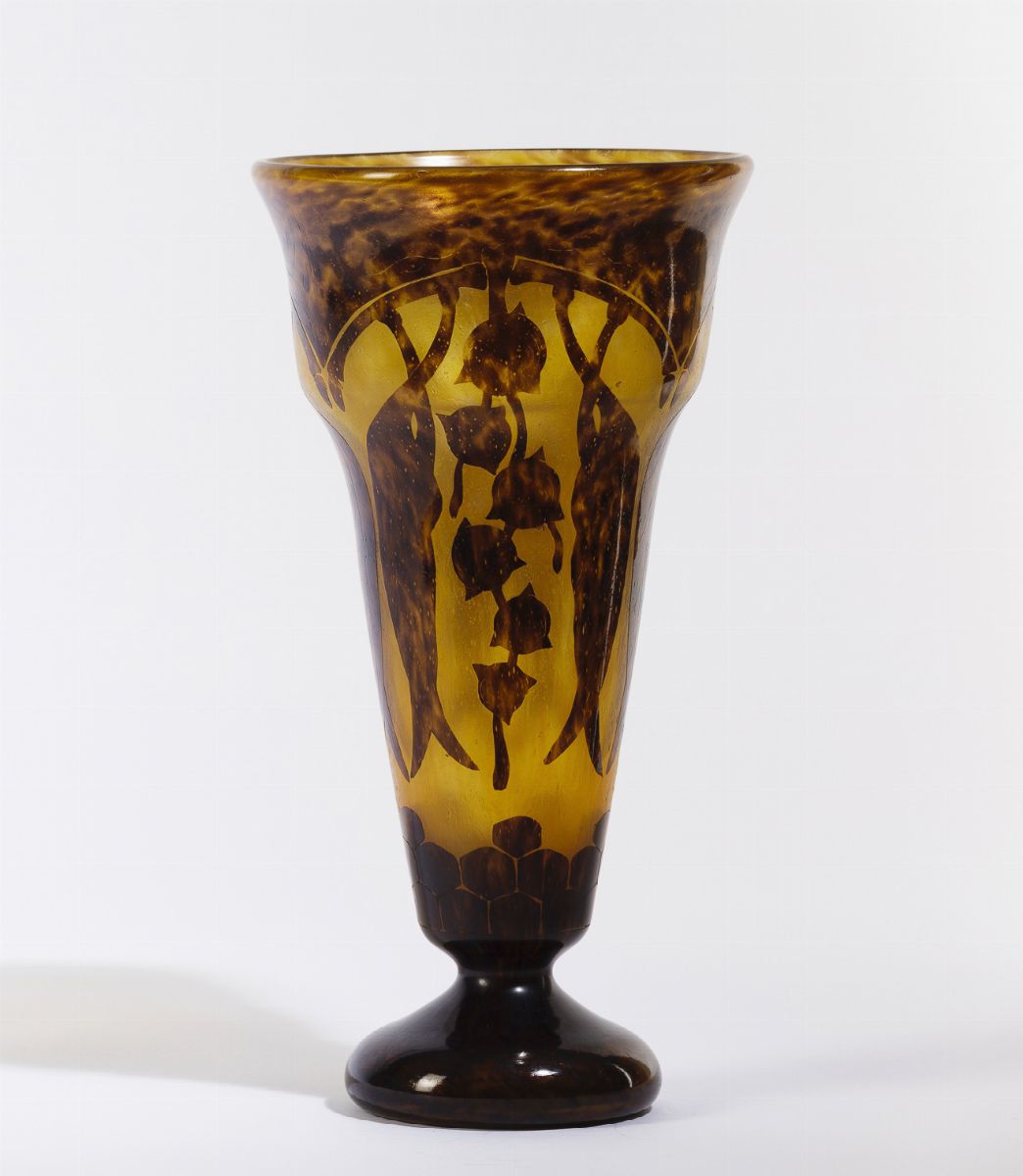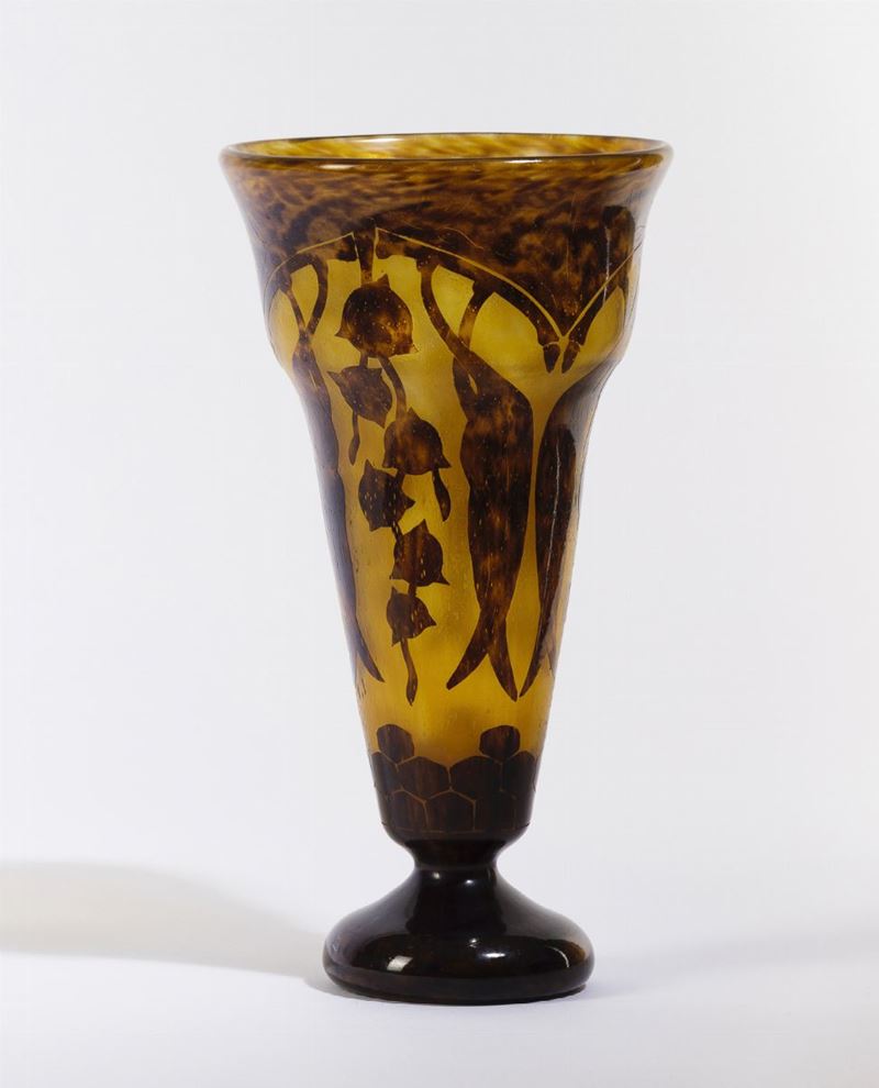 Vaso a campana su piede a bulbo in vetro a cammeo con decoro floreale stilizzato.