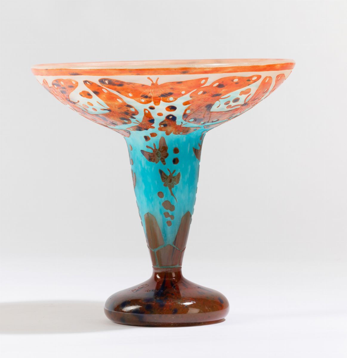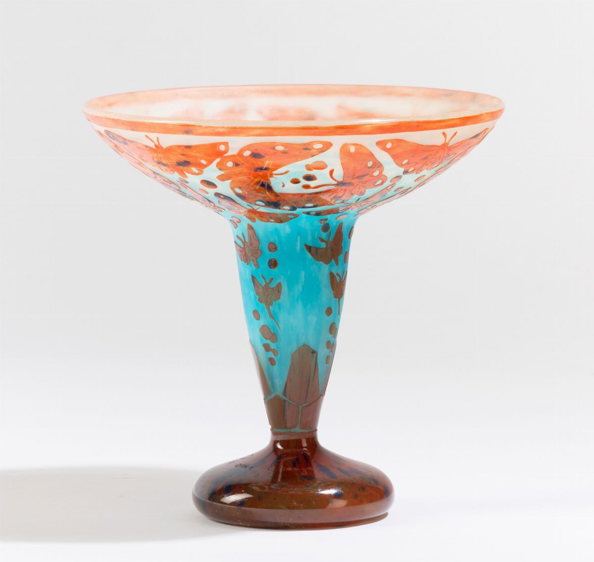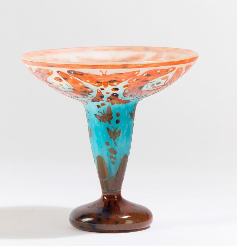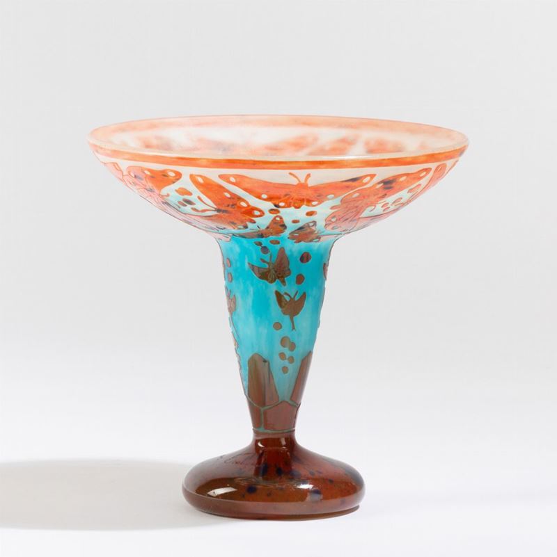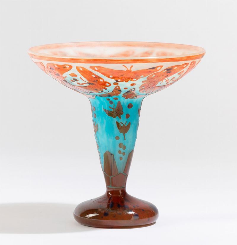 Coppa in vetro soffiato con decoro a cammeo di farfalle.