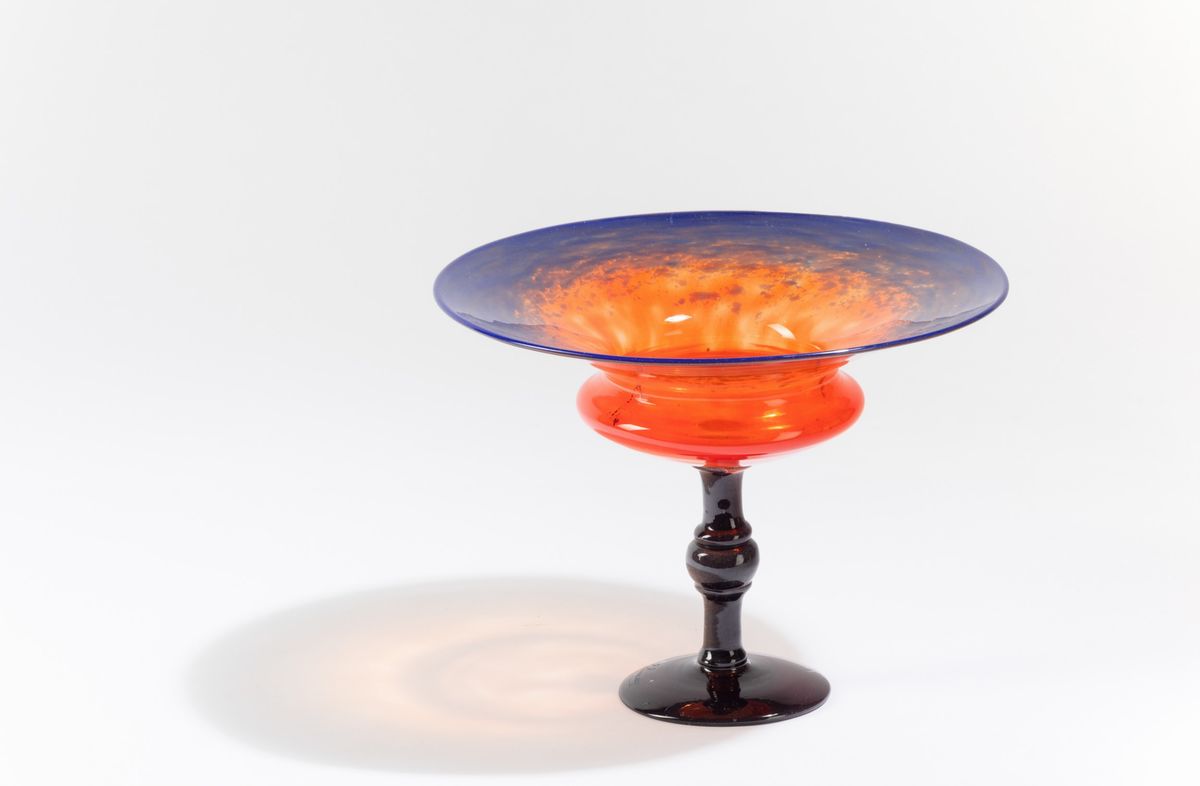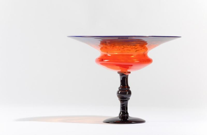 Coppa troncoconica in vetro soffiato con decoro di polveri su alto piede a balaustro.