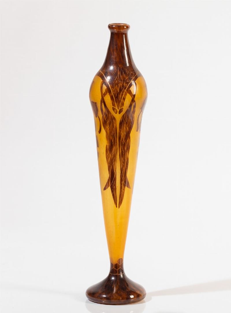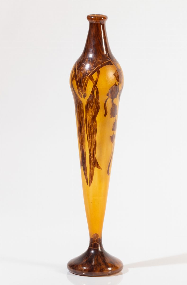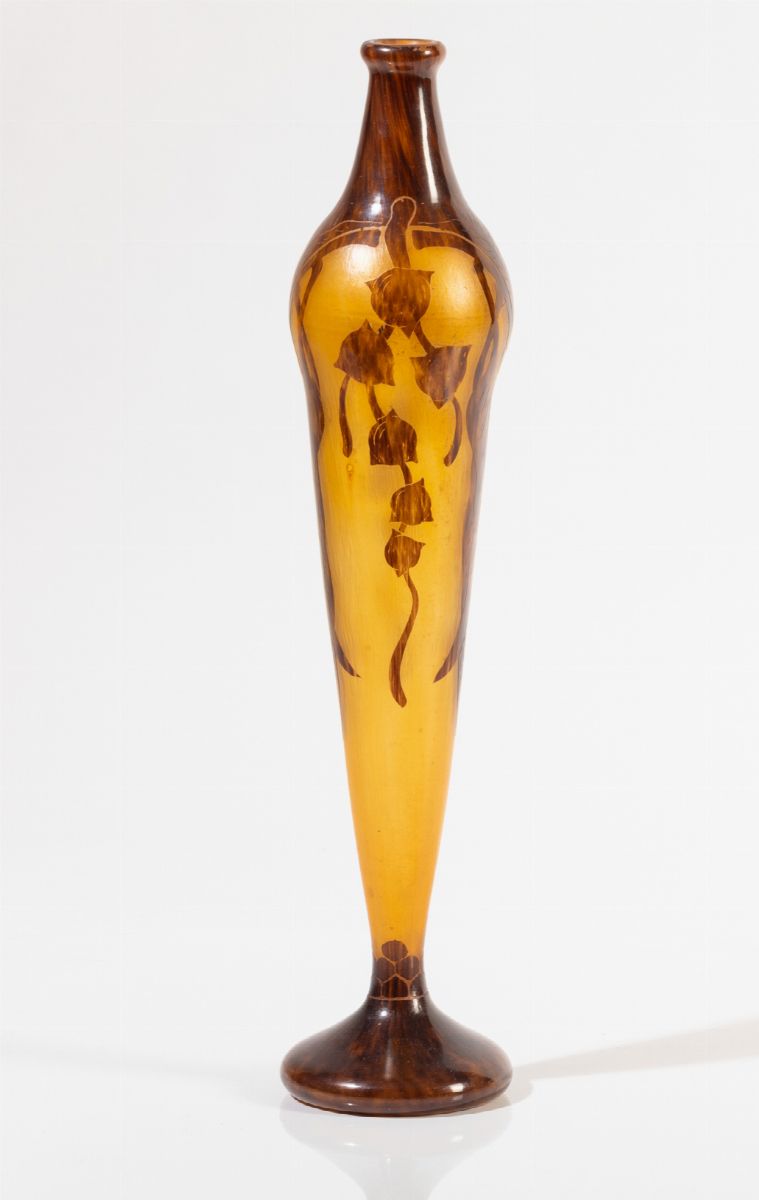 Vaso solifleur in vetro a cammeo con decoro floreale.