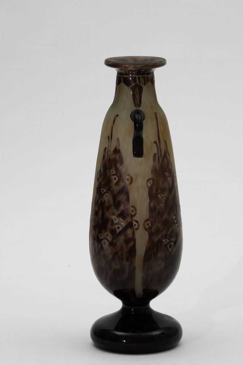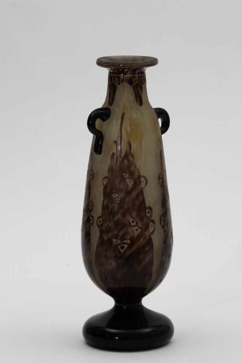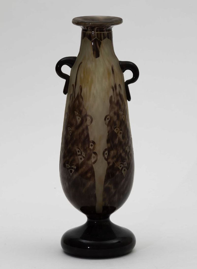 Vaso in vetro a cammeo con anse applicate a decoro di fiori stilizzati.