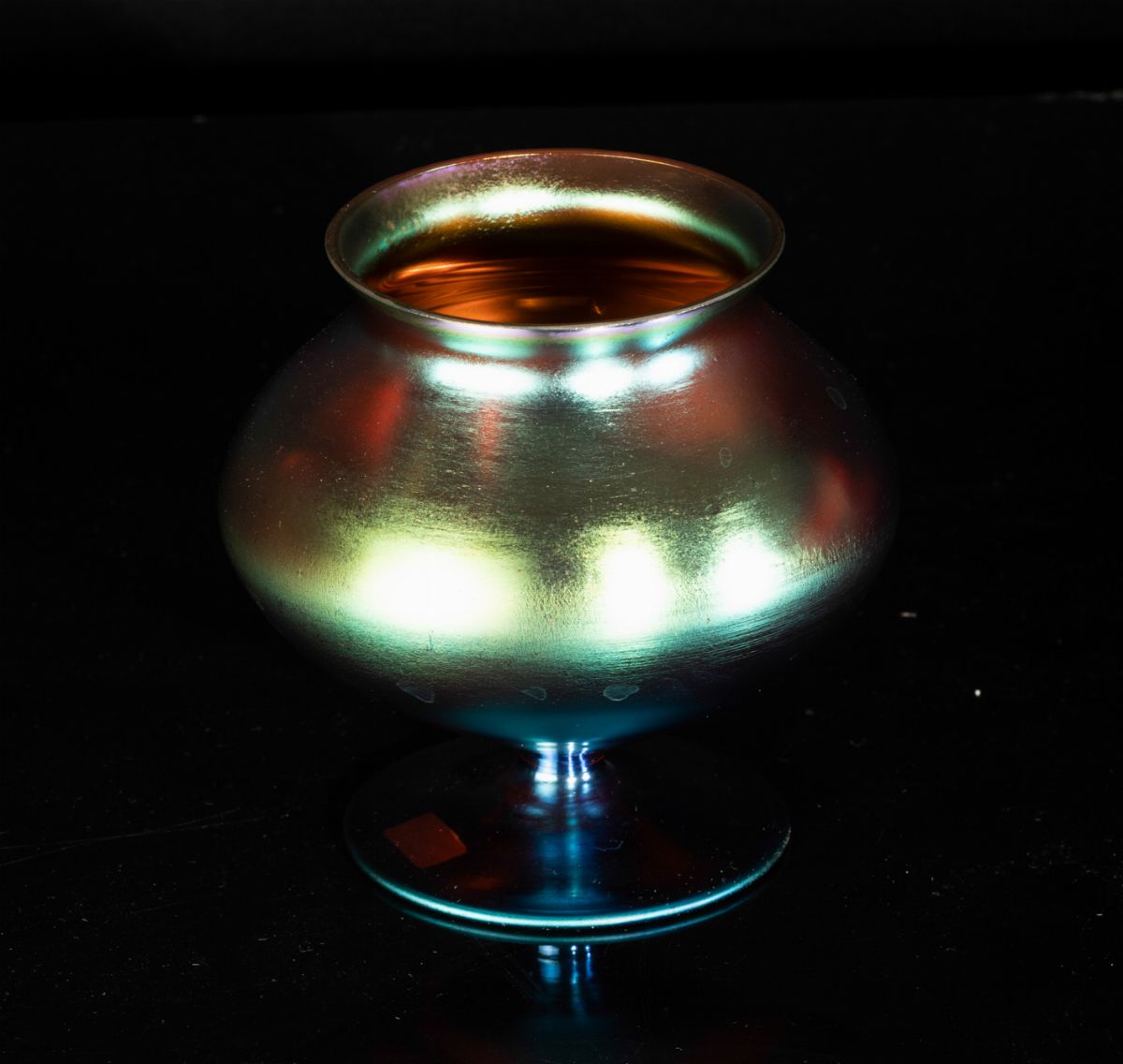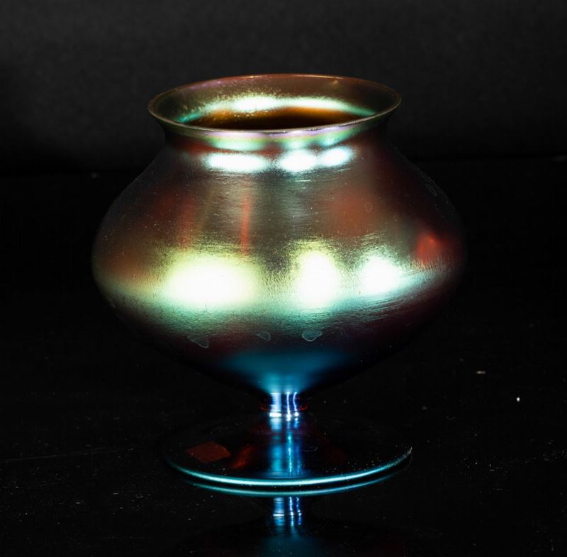 Piccolo vaso globulare su piede troncoconico in vetro soffiato con superficie interamente iridata.