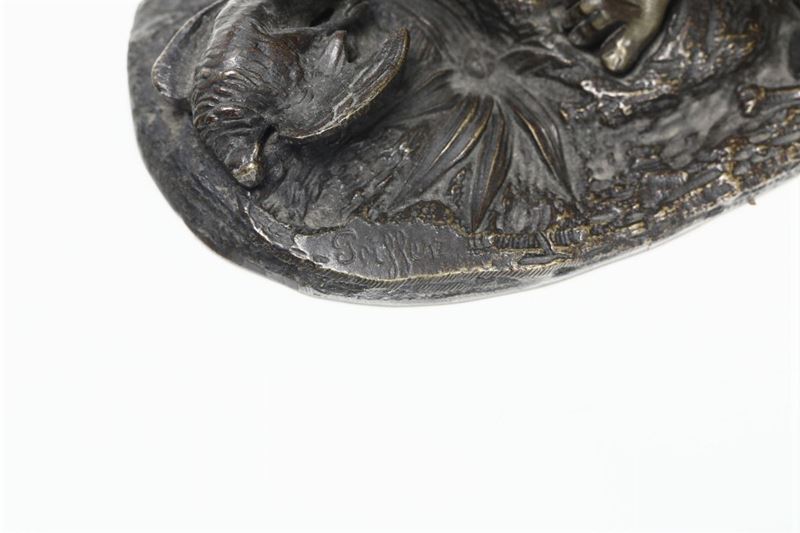 Scultura in bronzo raffigurante bimbo con cane, inizi XX secolo