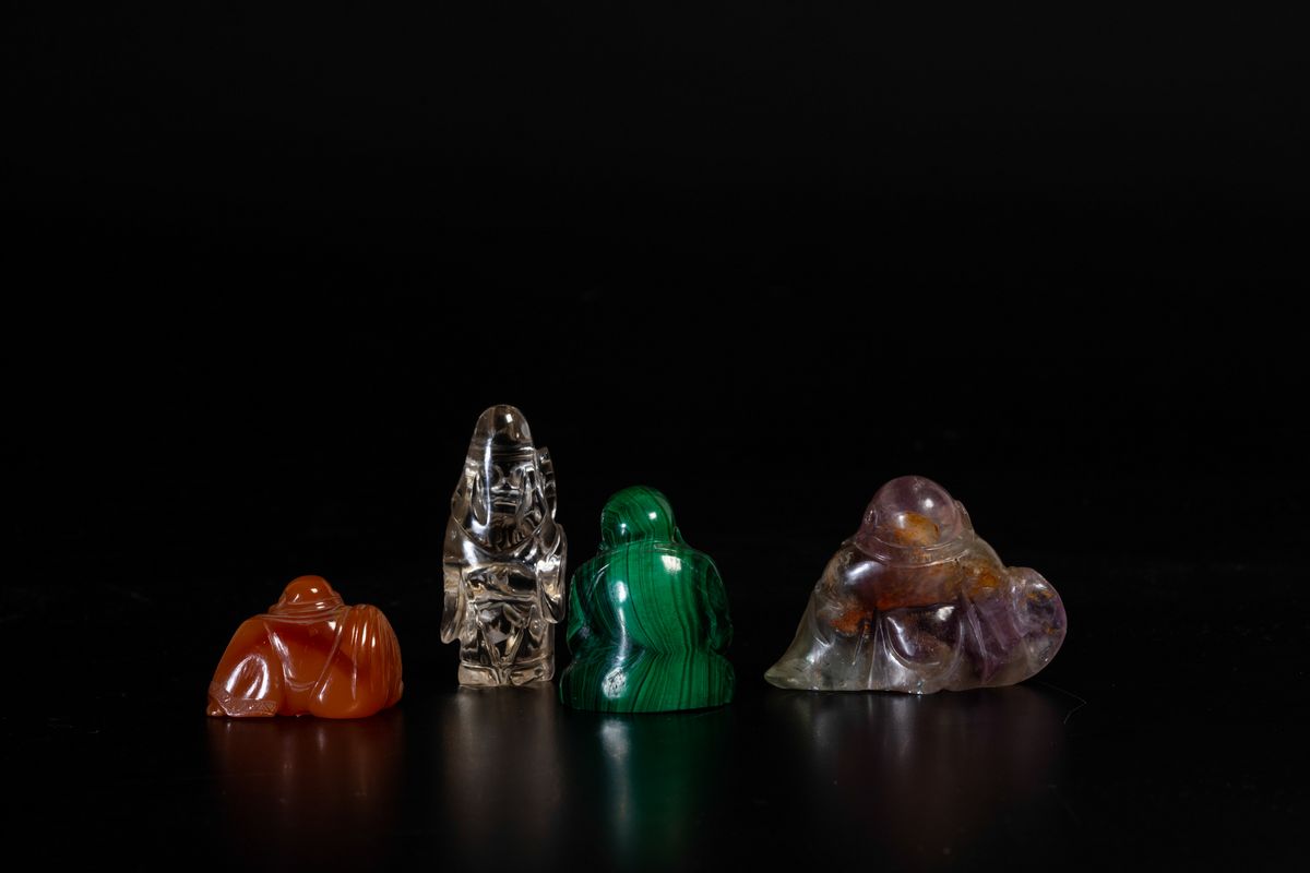 Lotto composto da piccole sculture in materiali diversi in pietra dura tre raffiguranti Budai e una saggio, Cina, XX seco [..]