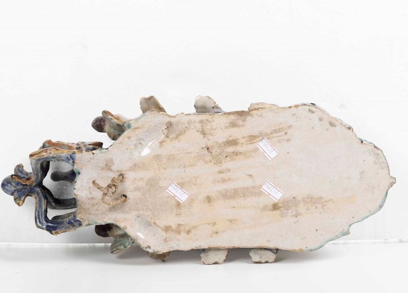 Maiolica. Altezza cm 40. Conservazione: ottima qualche piccola sbeccatura e mancanza alla prima “palmetta luminosa” a sinistra; testa del putto in alto a destra restaurata