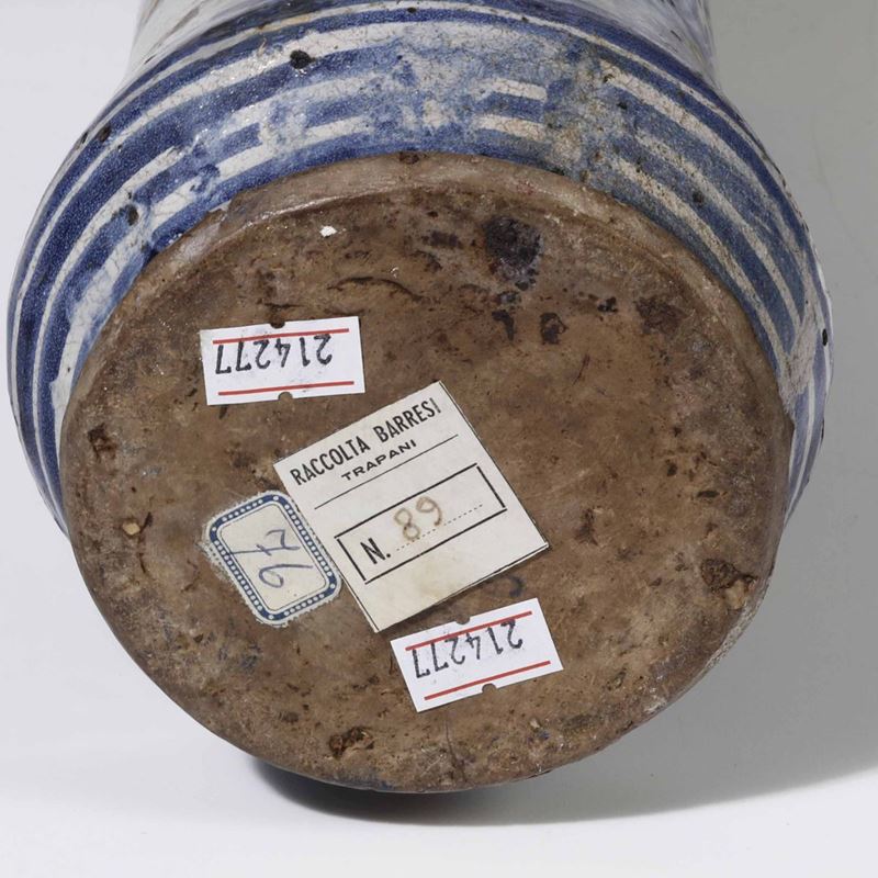 Maiolica. Altezza cm 29,5 circa. Conservazione: sbeccatura al bordo superiore e qualche minima caduta di smalto ripresa in restauro