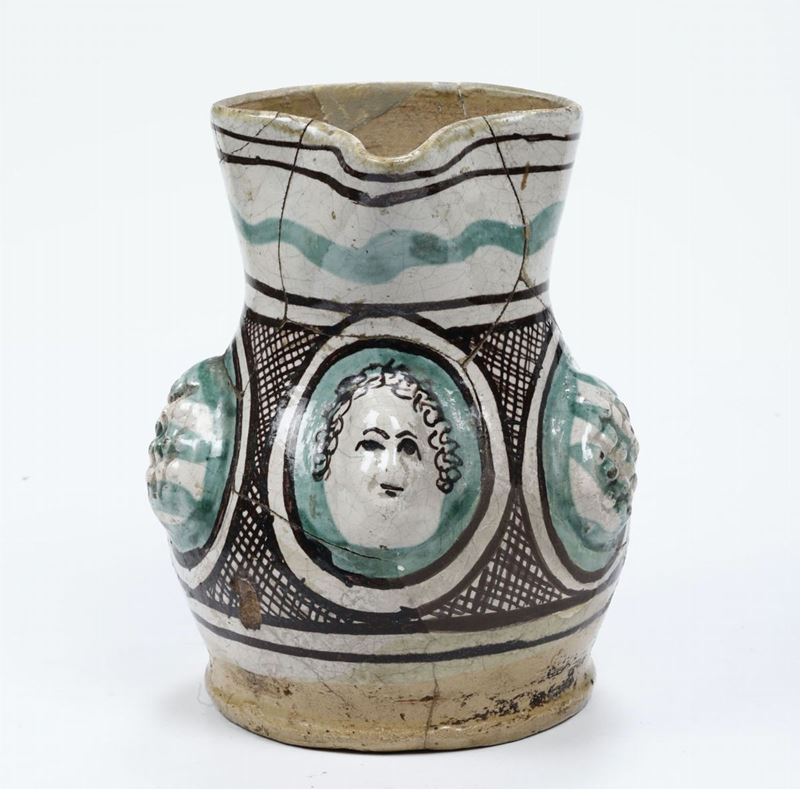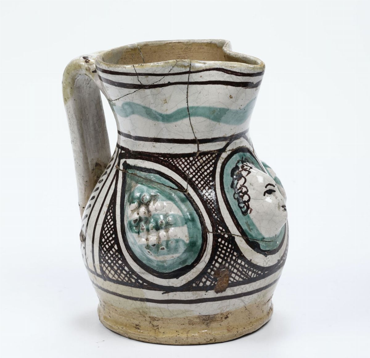 Piccolo boccale in maiolica arcaica con piede a disco, corpo rigonfio bocca trilobata e ansa a nastro e decorato a rilievo con testa femminile e due “pignette”. Il corpo è rivestito di smalto stannifero e decorato con un fondo graticcio nero e larghe pennellate verde ramina, secondo la formula orvietana.