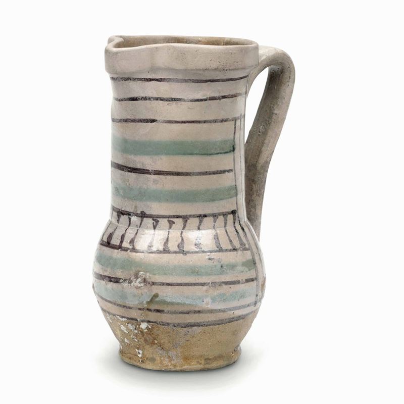 Boccale in maiolica arcaica dal corpo globulare con alto collo, labbro rigonfio e ansa a bastoncello, rivestito di smalto stannifero e decorato con un motivo di fasce disegnato in bruno di manganese con nastri colorati in verde ramina.