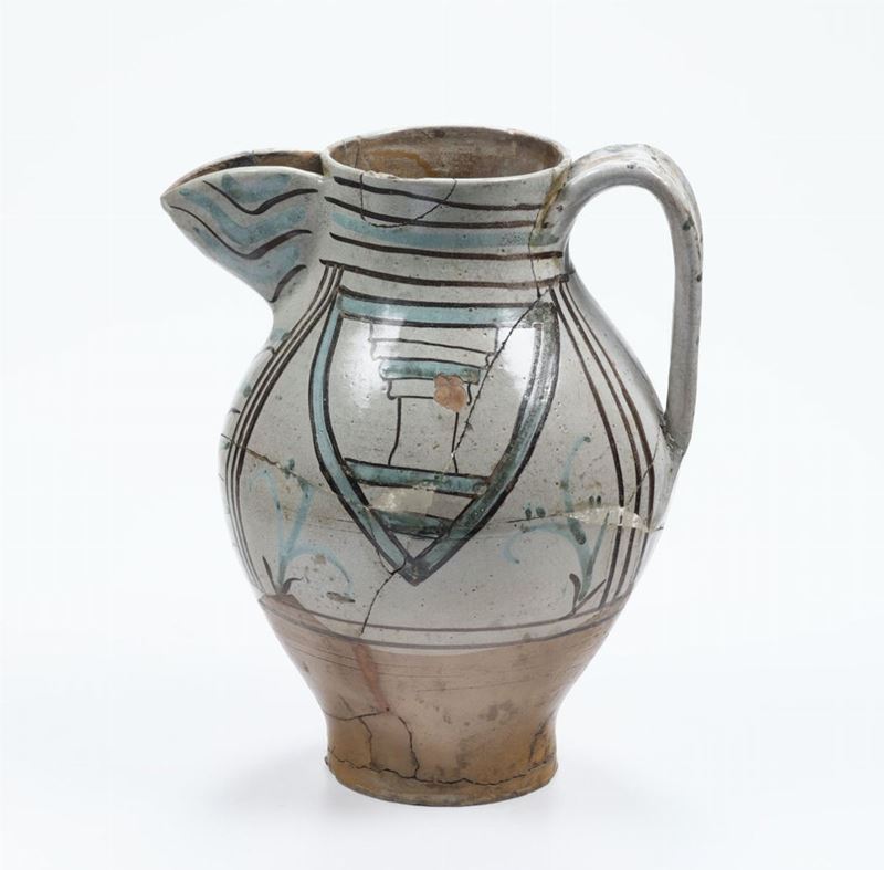 Grande brocca (o “panata”) dal corpo ovoidale con collo cilindrico, versatore “a becco di pellicano” e ansa a nastro, è rivestito all’esterno di smalto stannifero e porta, sulla spalla, disegnato lo scudo araldico della famiglia Colonna. Il disegno è in nero di manganese colorato con spesse linee in verde ramina. Un pezzo simile per forma e impostazione decorativa appartiene al Museo Internazionale delle Ceramiche di Faenza, vedi A. Satolli, La ceramica orvietana del Medioevo, Firenze 1983, p.61, n.31
