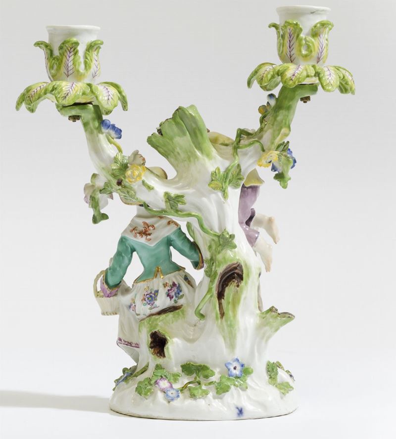 Porcellana. Marca: spade in blu sullo zoccolo. Altezza cm 24,6. Conservazione: restauri alla sommità dell'albero accanto al nido, al cappello, al cestino, parte di un piede e di una mano; restauri minori alla vegetazione; bobeches probabilmente di epoca posteriore