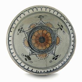 Piccola ciotola in maiolica, decorata in bicromia blu e arancione, con – al centro - un fiore stilizzato in un motivo geometrico, composto da un anello in un pentagono, dai cui vertici partono corti steli con tre piccole bacche blu. Il retro porta pennellate radiali degli stessi colori. Cfr. L.Frazzoni, Ceramiche del Museo Farnese, Bolsena 2007, p.19