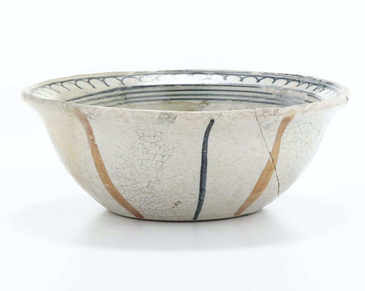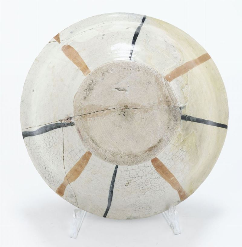 Maiolica arcaica. Altezza cm 8; diametro cm 16,2. Conservazione: rotta in diversi frammenti e ricomposta con integrazioni