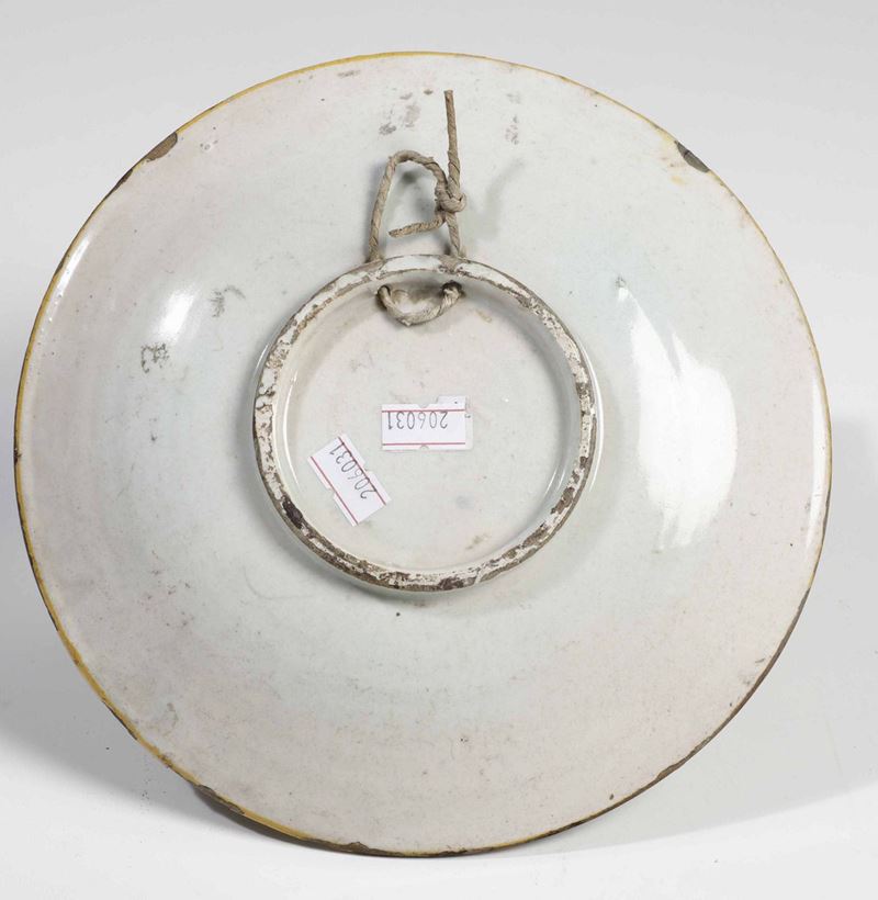 Maiolica. Altezza cm 3.7; diametro cm 21,5. Conservazione: ottima; usure di smalto al bordo