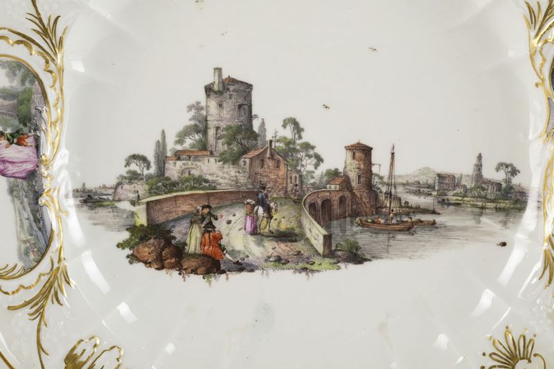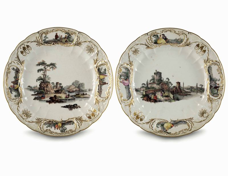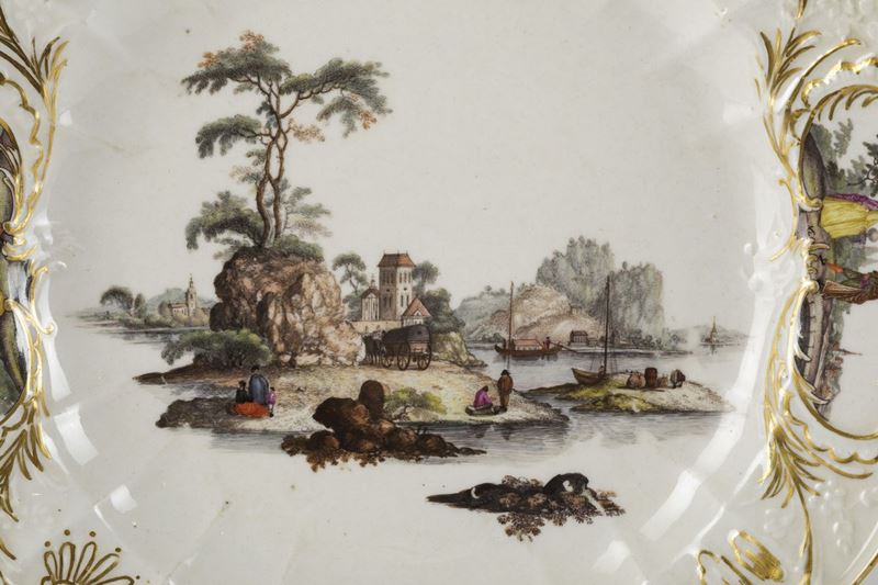 I piatti, dal bordo mistilineo, sono modellati a rilievo, in parte rialzato in oro, con il cosiddetto motivo “Dulong” dal nome del commerciante di Amsterdam per il quale fu eseguito per la prima volta nel 1743. Dulong era comproprietario della ditta Godefroy e Dulong che dal 1737 acquistava porcellana di Meissen