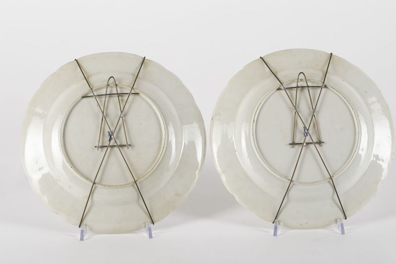 Porcellana. Marca: spade in blu; numero 22 impresso. Diam. cm 24,8 circa. Conservazione: ottima; insignificante sbeccatura al bordo di un piatto; minime usure alla policromia