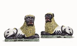 Luneville, una cittadina situata nel dipartimento della Meurthe e Mosella nell’est della Francia, è diventata famosa per le sue maioliche che iniziò a produrre all’inizio del Settecento. La coppia di leoni speculari fu uno dei suoi motivi prediletti. Concepiti quali sculture da parata venivano posati ai lati degli scaloni. Sono dipinti in maniera stravagante e di grande effetto in manganese, giallo, verde, rosso per la bocca ed il naso, azzurro per gli occhi. Le orecchie sono forate