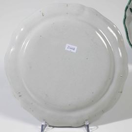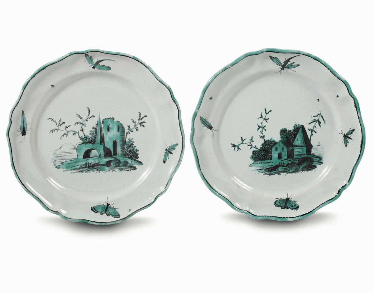Due piatti tondi, dal profilo esalobato, decorati col motivo “a paesi verdi” con casolari, torri e piramidi classiche su una zolla erbosa; sulla tesa insetti e “semis”. Questa decorazione in monocromia verde fu una delle formule vincenti della manifattura bolognese di Giuseppe Finck. Piatti molto simili sono pubblicati da G. Asioli Martini, Da Giuseppe a Leopoldo Finck. Maioliche bolognesi del Settecento, catalogo della mostra, Bologna 2000, pp. 144-152, il più simile n.47