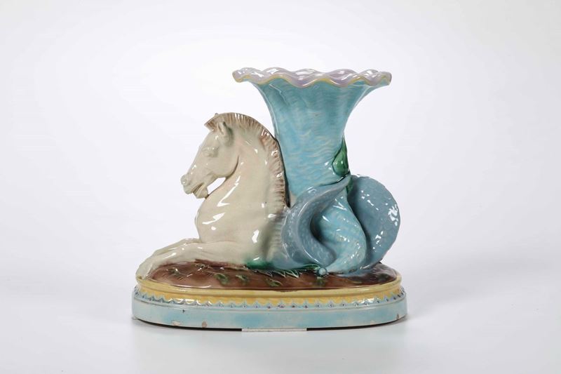 Il vaso è formato da un cavallo marino a mezzobusto, con testa e zampe anteriori equine, che termina con una coda di delfino. Questa avvolge una conchiglia a forma di cornucopia che s’innalza a mo’ di contenitore per i fiori