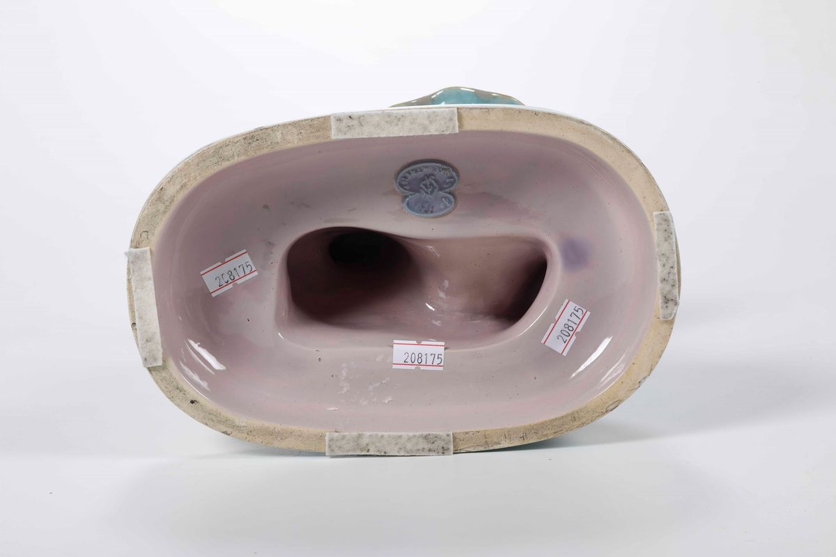 Maiolica. Marca: cartiglio bilobato con lettere “GJ” e “Stoke on Trent” in rilievo; numero del modello “1953” tracciato a mano in nero. Dimensioni: Altezza cm 19,7; 22,2 x 14,2. Conservazione: minime sbeccature al bordo inferiore e alle orecchie