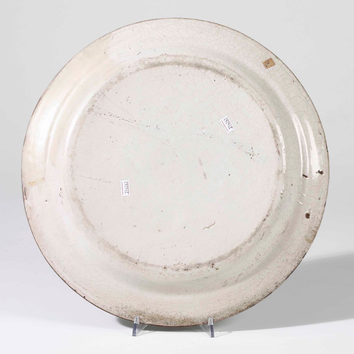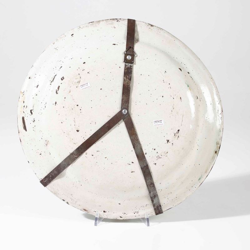 Maiolica. Diametro cm 42. Conservazione: una rottura sulla tesa e una piccola sbeccatura nel cavetto ricomposte in vecchio restauro; craquelures