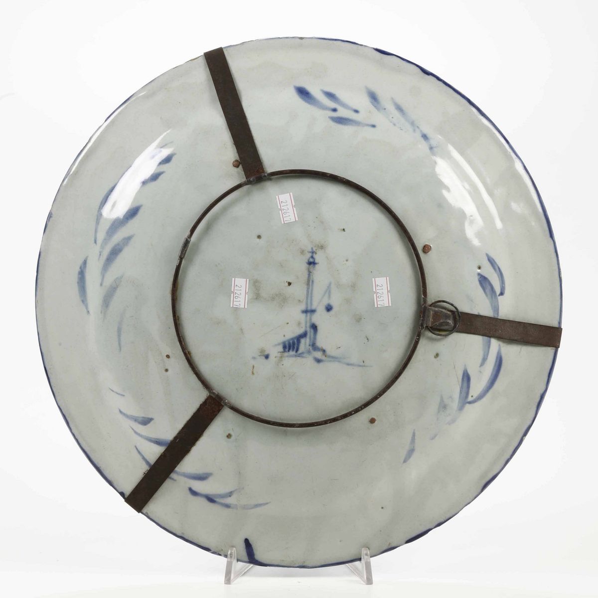 Maiolica a gran fuoco in monocromia blu di cobalto. Marca: lanterna in blu. Diametro cm 39,5. Piccole sbeccature e restauri sul bordo