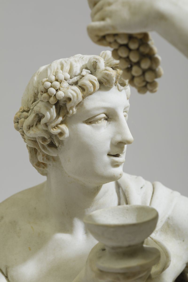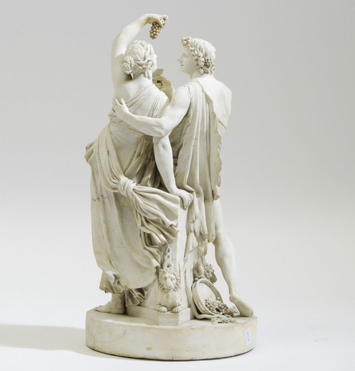 Porcellana biscuit. Marca: assente. Altezza cm 43,5. Conservazione: restauri minori alla base, ad un leone, alle dita di un piede, alla coppa e a qualche grappolo d'uva; mancanze minori
