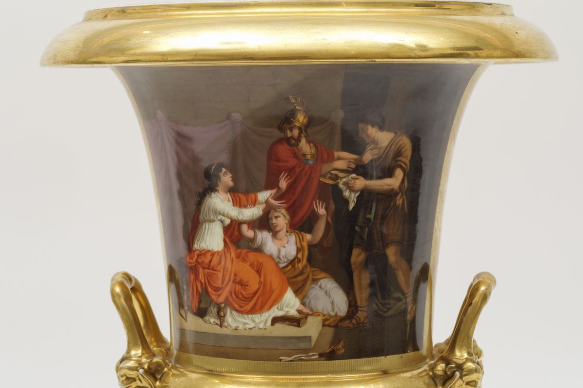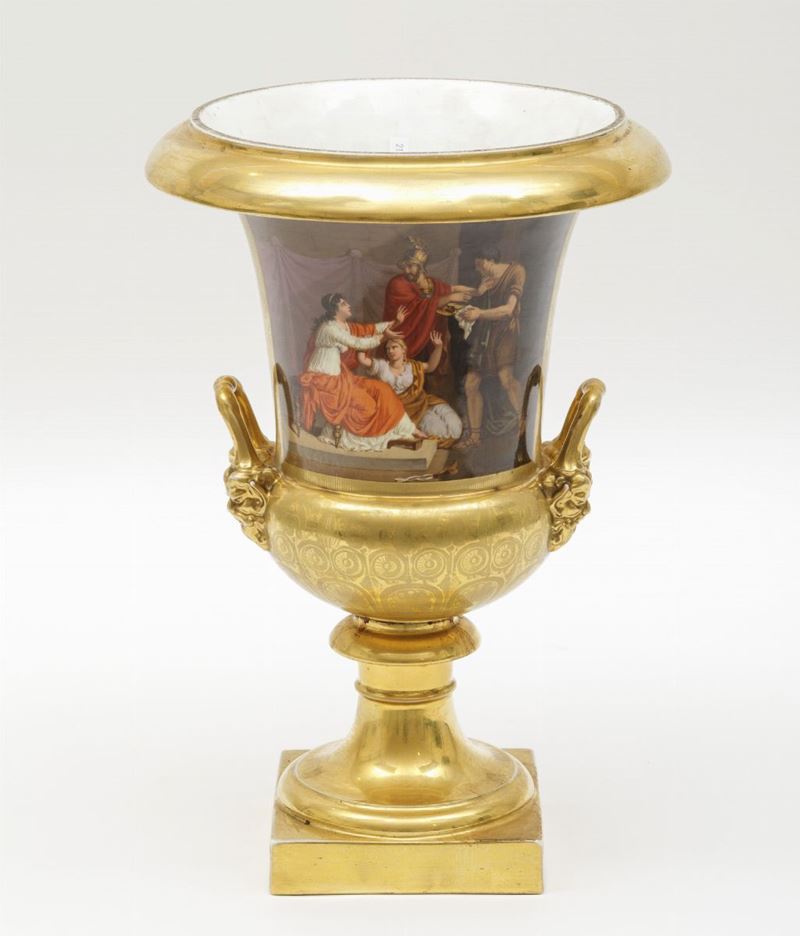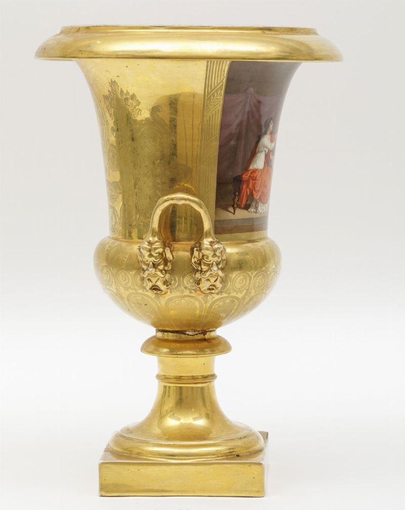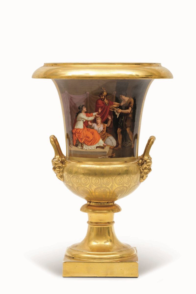 Il vaso dalla cosiddetta forma “Medici” ha i manici che poggiano sul capo di due mascheroni barbuti in rilievo e sono decorati sul recto, nella fascia centrale, con una riserva con una scena policroma da melodramma con quattro personaggi: probabilmente Sophonisba che riceve la coppa con il veleno. Il resto della superficie è dorato ed impreziosito con motivi graffiati geometrici, con palmette e altra vegetazione stilizzata