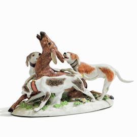Porcellana. Marca: spade in blu. Altezza cm 9,3; 15 x 7. Conservazione: le code dei cani ricomposte in restauro; un orecchio del cervo restaurato