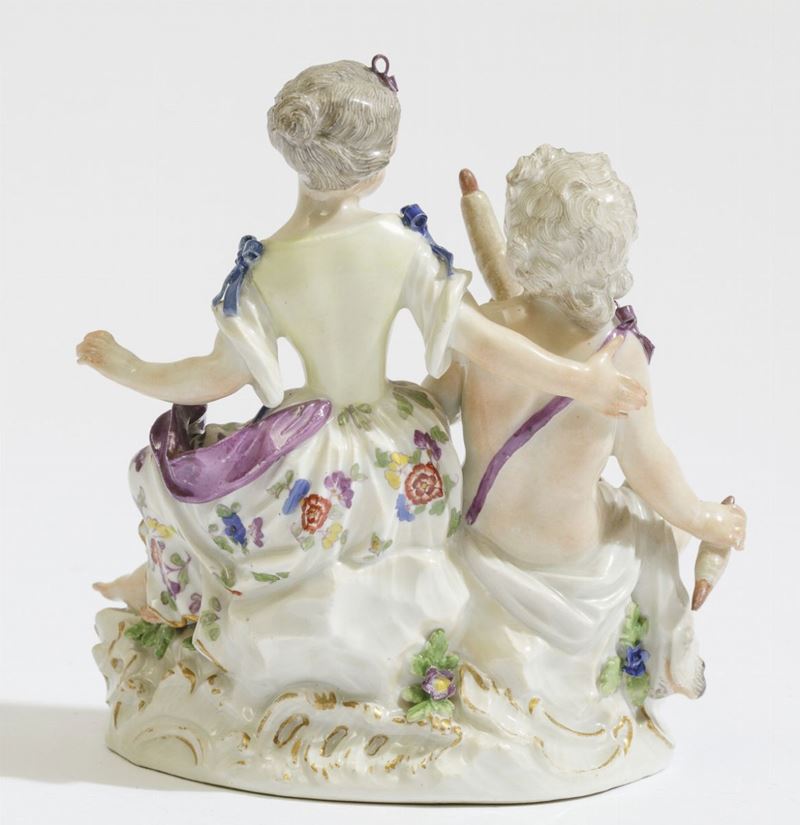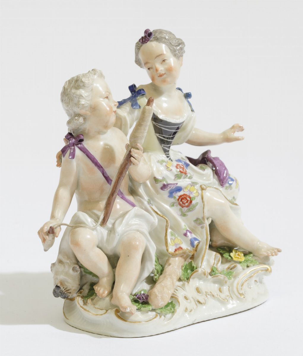 Il gruppo, probabile modello di J.J.Kaendler, raffigura una ragazza e un putto seduti su una base a rocailles. Mentre la giovane appoggia amorevolmente una mano sulla spalla del putto, questi è intento a filare la lana con un fuso, ai suoi piedi a sinistra una clava e a destra una pelle di leone