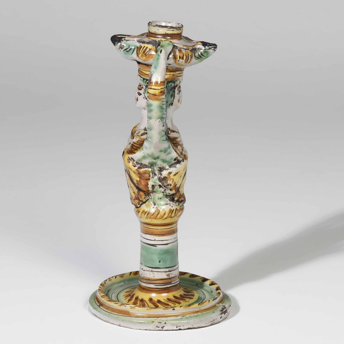 Maiolica policroma a gran fuoco. Marca: assente. Dimensioni: altezza cm 28,7 c.a. Conservazione: ottima; qualche piccola caduta di smalto
