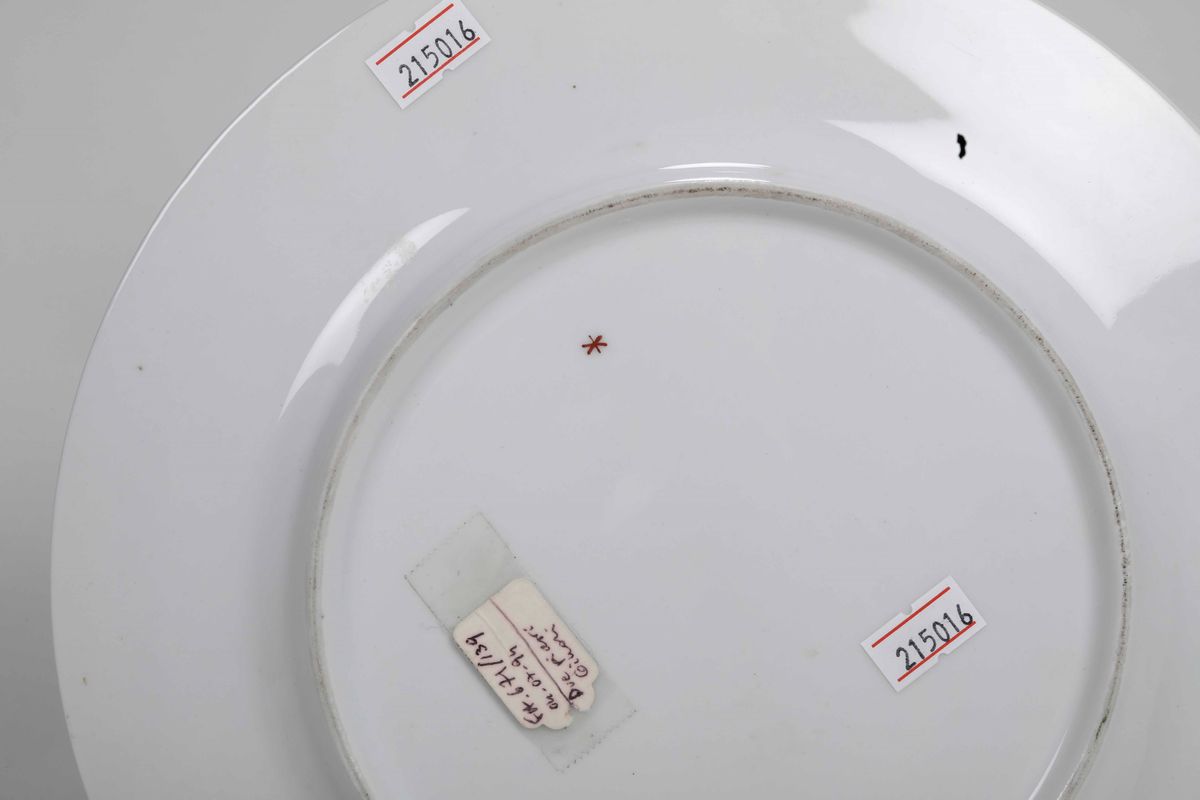 Porcellana. Marca: stella in rosso. Dimensioni: diametro cm 25,6. Conservazione: leggere usure all’oro del cavetto.