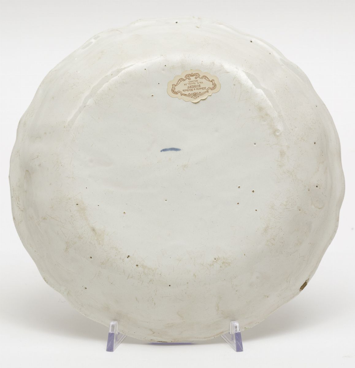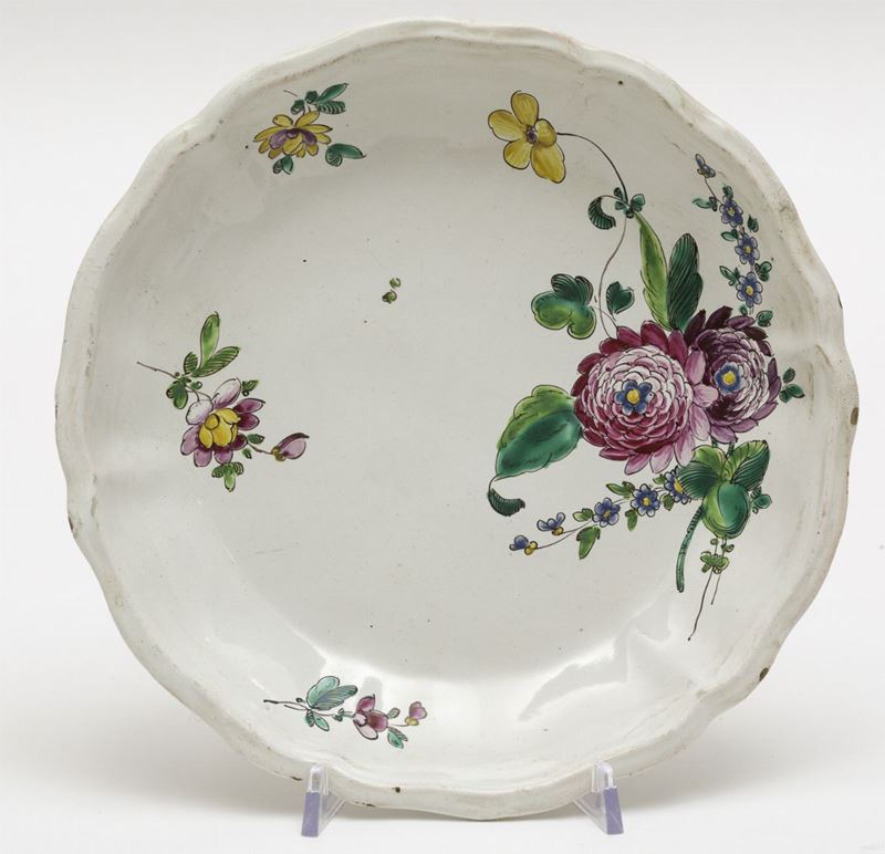 Piatto fondo esalobato, rivestito di smalto stannifero ricco di stagno, decorato in ricca policromia a piccolo fuoco “a smalto” con un motivo di fiori stilizzati “ad uso di Strasburgo”. Sul retro una pennellata in blu di cobalto ne testimonia la produzione milanese