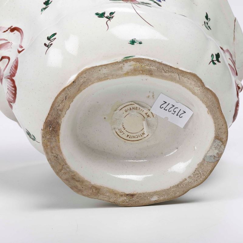 Maiolica policroma a piccolo fuoco. Marca: assente. Altezza cm 12; 17,5 x 14,3. Conservazione: una piccola rottura al bordo superiore rincollata; piccole sbeccature al bordo inferiore con vecchio restauro