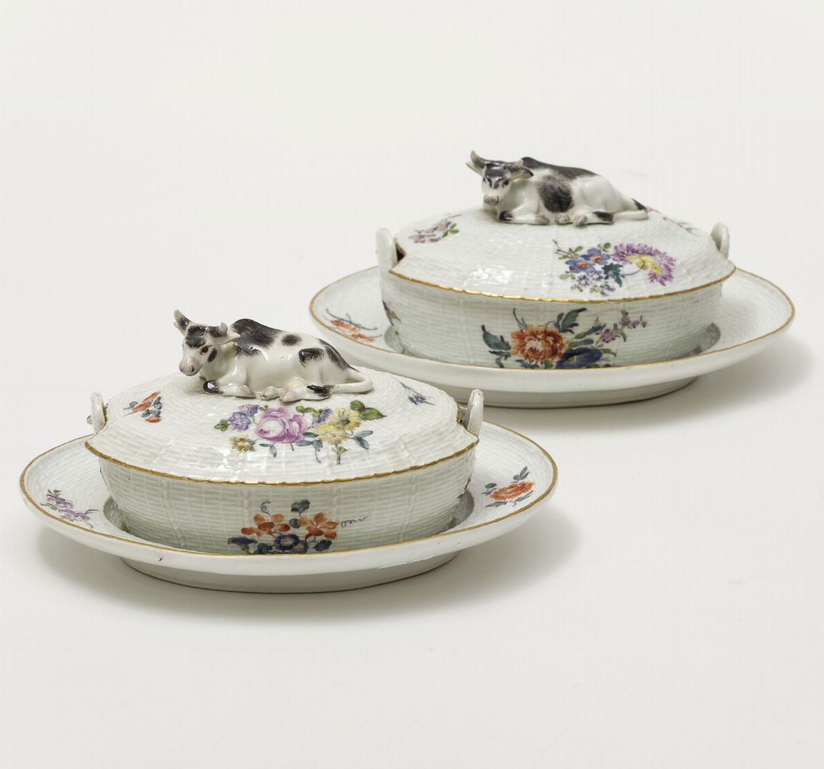 Le due burriere, dalla forma ovale, con sottopiatto hanno le superfici lavorate a rilievo a cestello di vimini, motivo detto “Altozierrelief”. Una figurina di mucca sdraiata e ruminante è posta sul coperchio e funge da presa. La decorazione policroma vede ramoscelli fioriti sparsi di “Deutsche Blumen” disposti simmetricamente