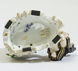 Porcellana. Marca: spade con punto tra le else e numero 3 in blu; numero 3011 impresso. Altezza cm 18,5. Conservazione: un piede restaurato; un mignolo mancante; restauri minori alla vegetazione e ad alcuni nastri