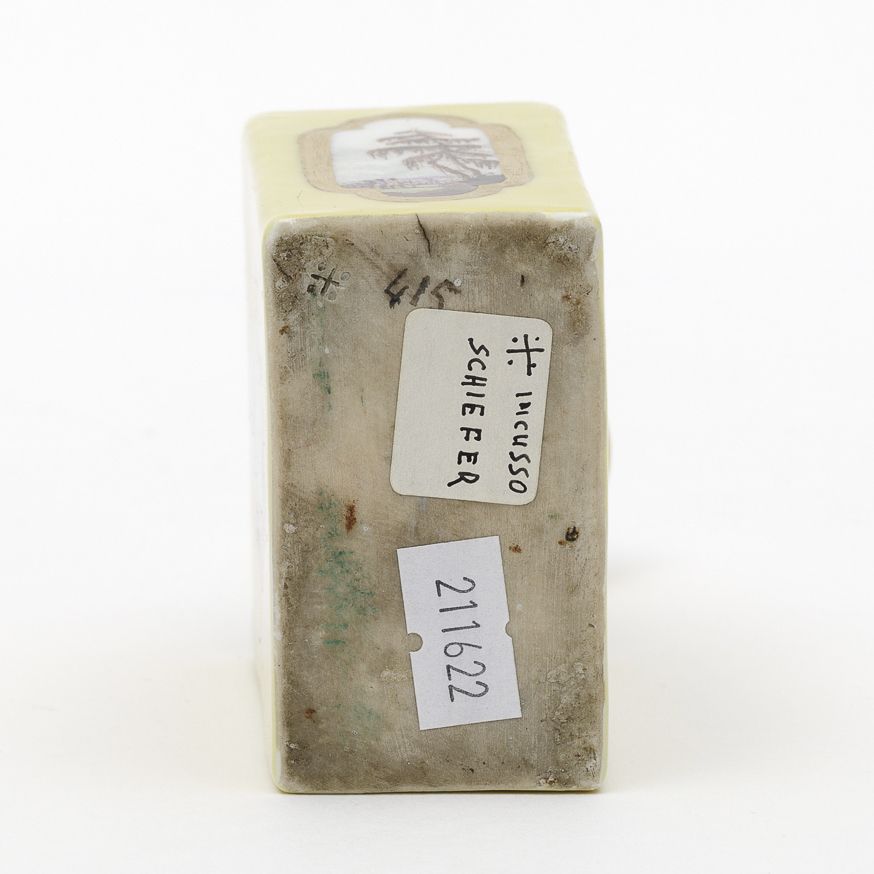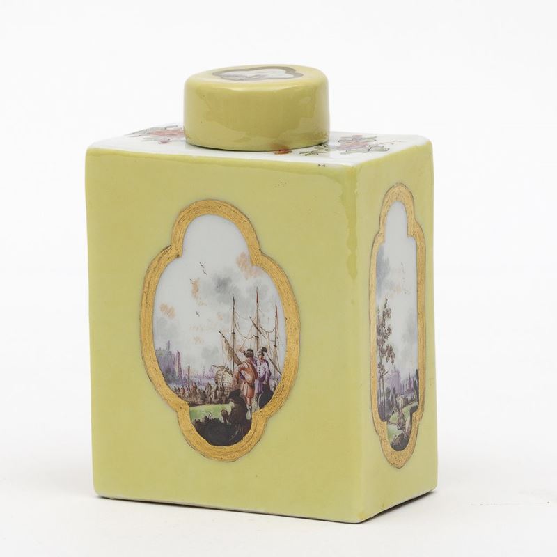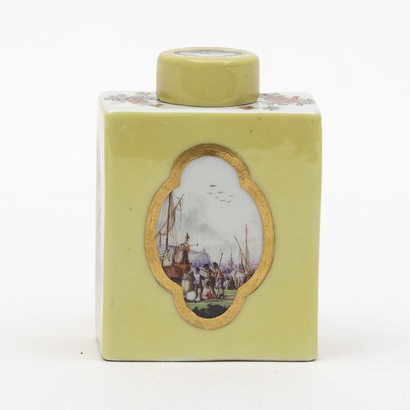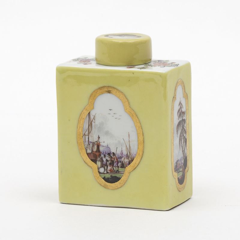 La scatola dal fondo giallo e dalla forma a parallelepipedo, ospita sui quattro lati, una riserva quadrilobata, incorniciata in oro, con scene di porto policrome miniaturizzate. Sulla spalla troviamo due ramoscelli di fiori indiani