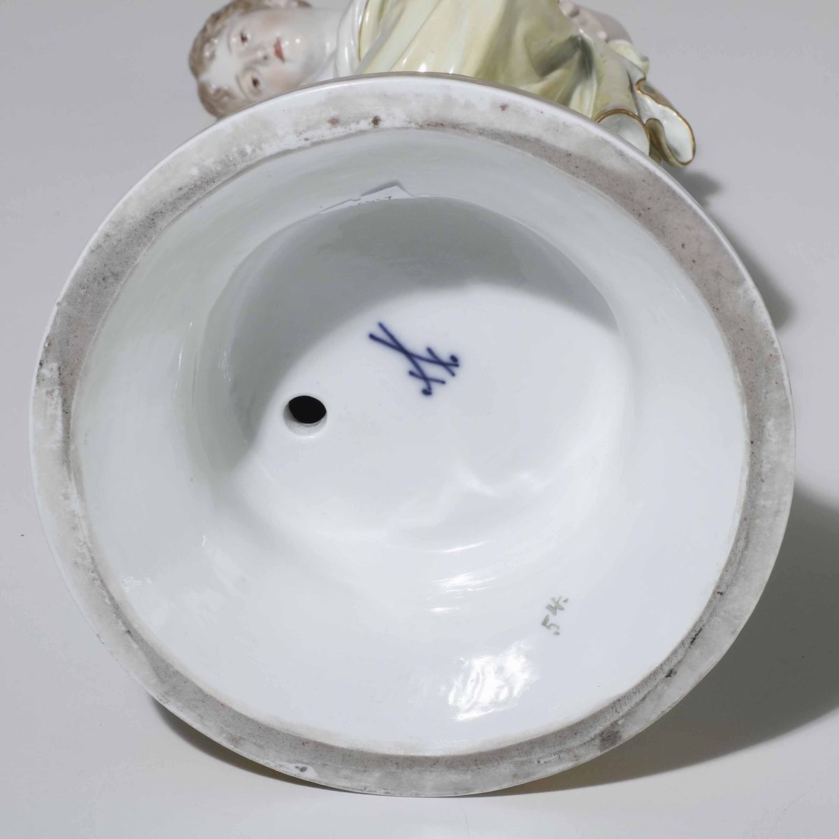 Porcellana policroma. Marca: spade in blu; “M 193.” inciso; “54.” in verde. Altezza cm 42,8. Conservazione: piccola mancanza al bordo di un sandalo