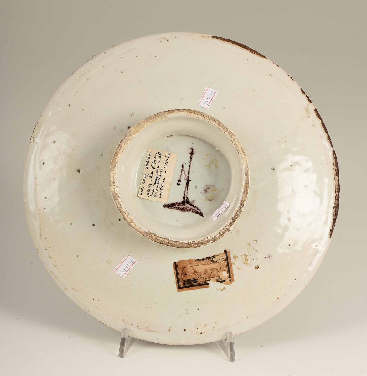 Maiolica. Marca: lanterna in manganese. Diametro cm 30. Salti di smalto sul bordo