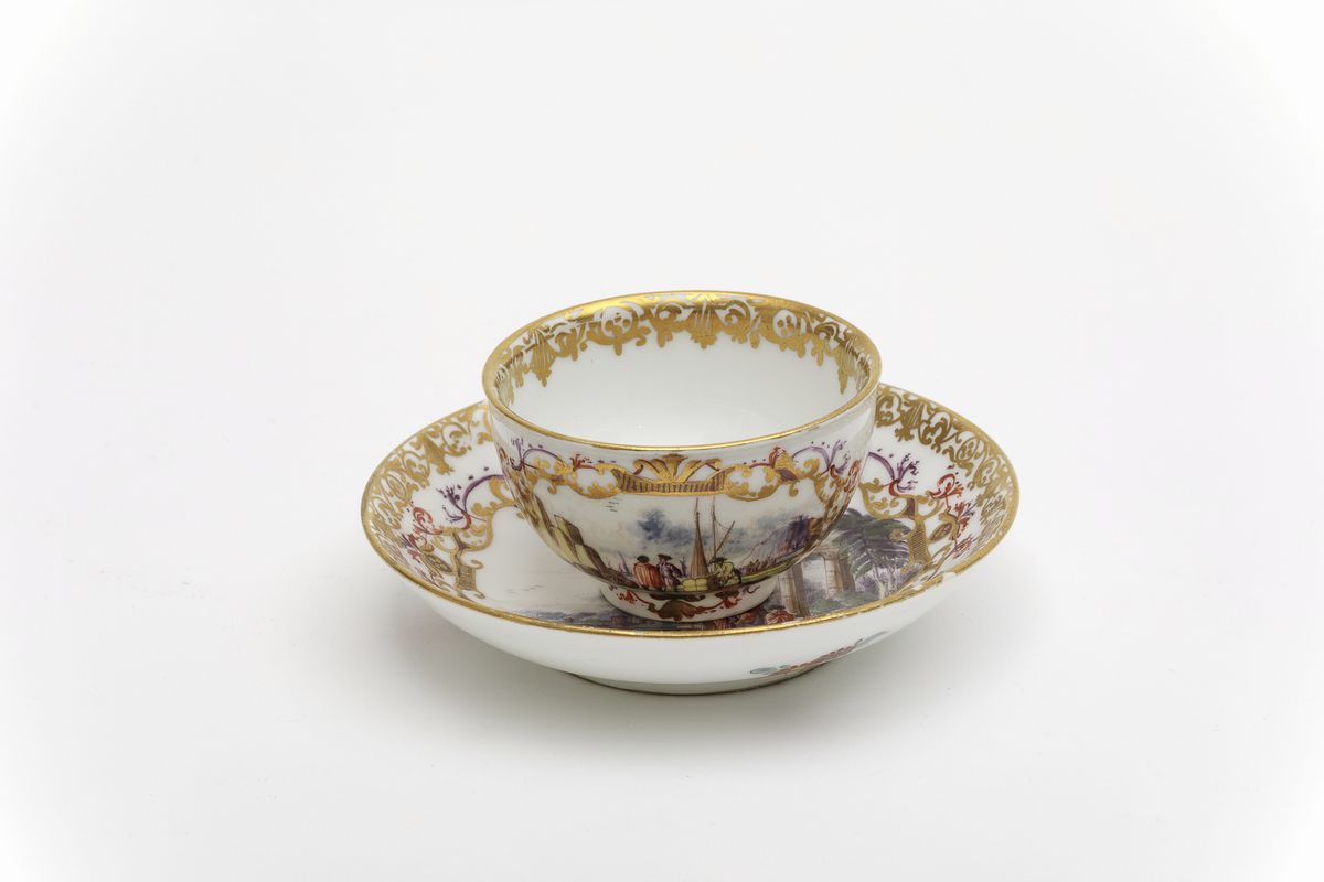 La tazza ed il piattino sono dipinte in policromia con vivaci scene di commercio marittimo e scene di genere racchiuse in elaborate riserve incorniciate dal “Laub- und Bandelwerk” (ossia “a foglie e nastri”) in oro, rosso ferro, rosso porpora e lustro di Böttger