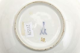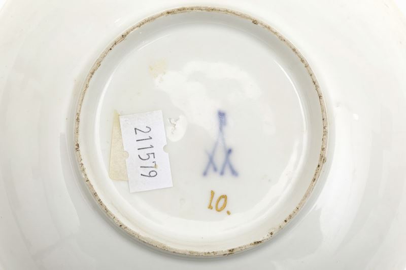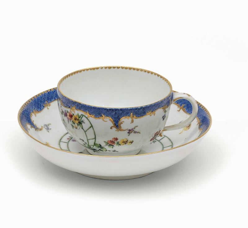 Porcellana. Marca: spade in blu; numero 10. in oro. Altezza tazza cm 4,7; diam. piattino cm 13,6. Conservazione: una felatura all'attacco inferiore del manico