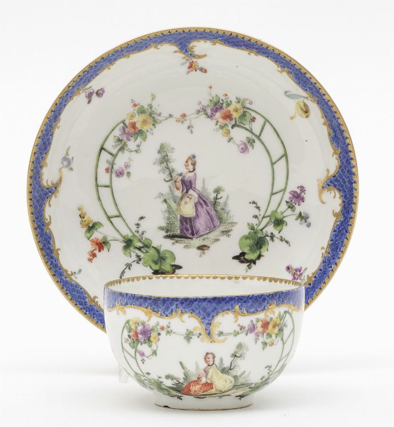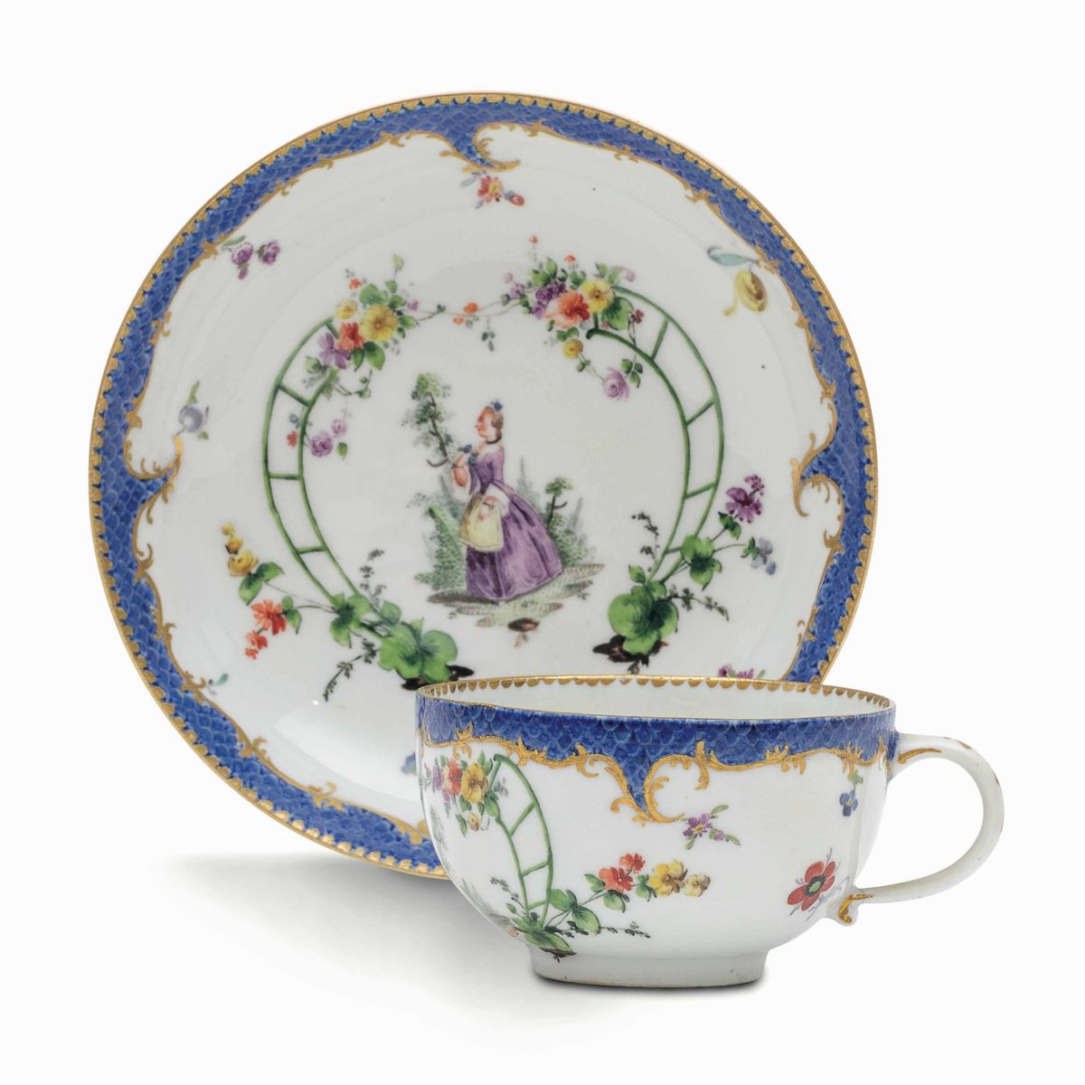 La decorazione policroma vede una riserva formata da una spalliera fiorita con all’interno una giovane nobile in un parco. Al bordo motivo a squame in blu incorniciato da rocailles in oro a cui sono appesi ramoscelli fogliati e fioriti. Un ramoscello fiorito è dipinto sul fondo della tazza