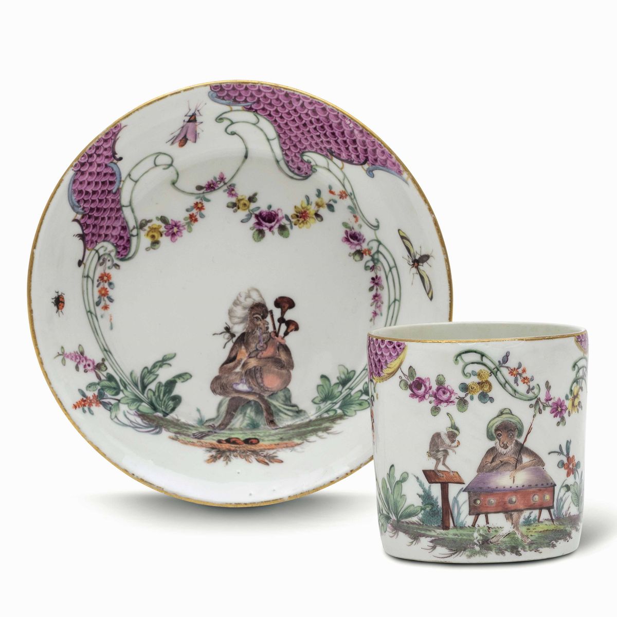 La tazza cilindrica, dal manico rialzato, e il piattino troncoconico ospitano una decorazione policroma con scimmie musicanti che poggiano su zolla erbosa da cui fuoriesce una pergola in verde con ghirlande fiorite e motivo a squame in rosso porpora. Inoltre insetti sparsi