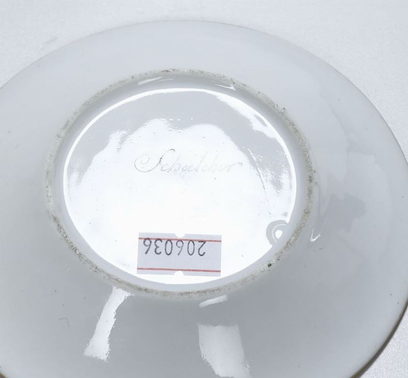 Porcellana. Marca: Schoelcher in nero sotto al piattino. Altezza tazza cm 6,8; diametro piattino cm 12,7. Conservazione: leggere usure all'oro del piattino