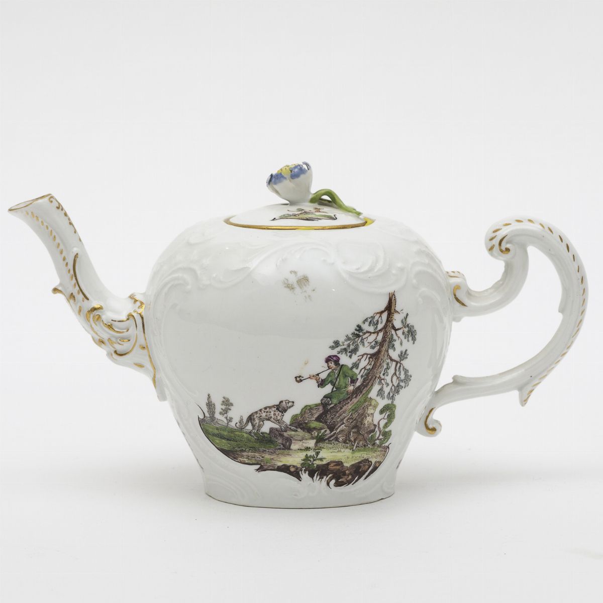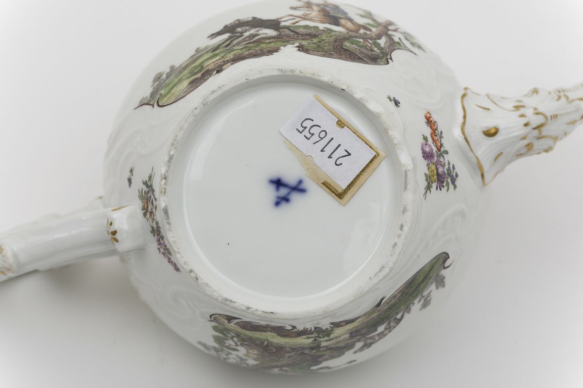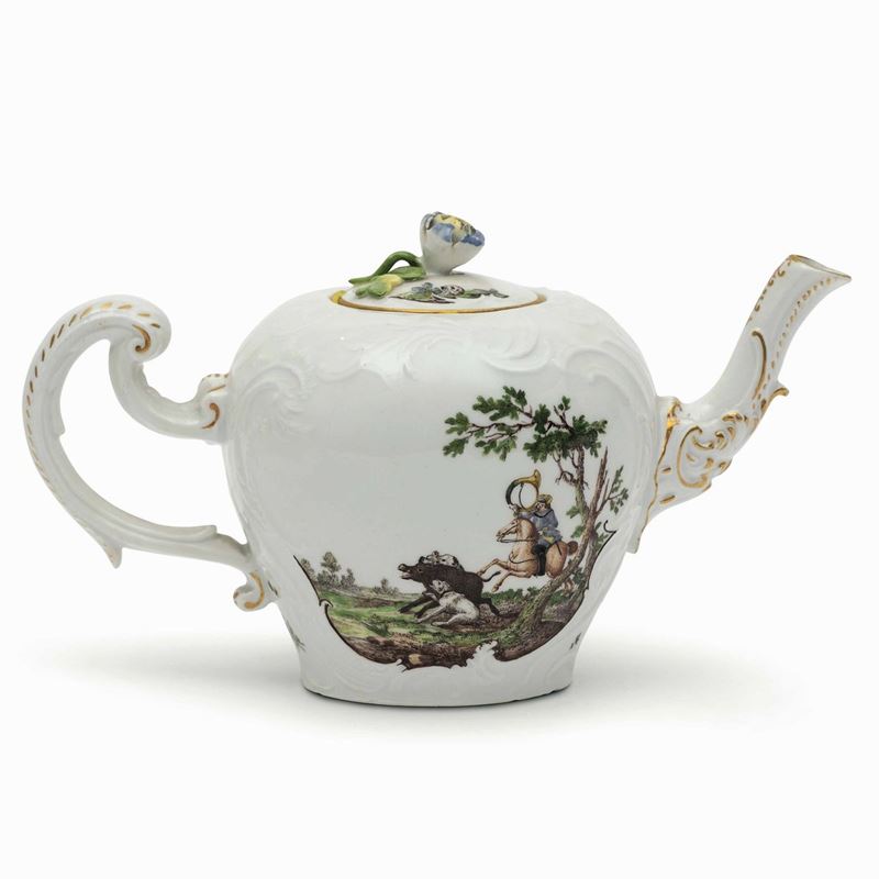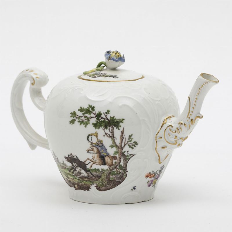 La teiera ha il manico ed il beccuccio a rocaille lumeggiati in oro, la presa del coperchio è a forma di bocciolo di fiore con foglie a rilievo. La superficie è percorsa da motivi vegetali a rocaille stilizzati in rilievo che formano due riserve dipinte in policromia con scene di caccia in paesaggi selvaggi. Inoltre ramoscelli fioriti e fogliati sparsi