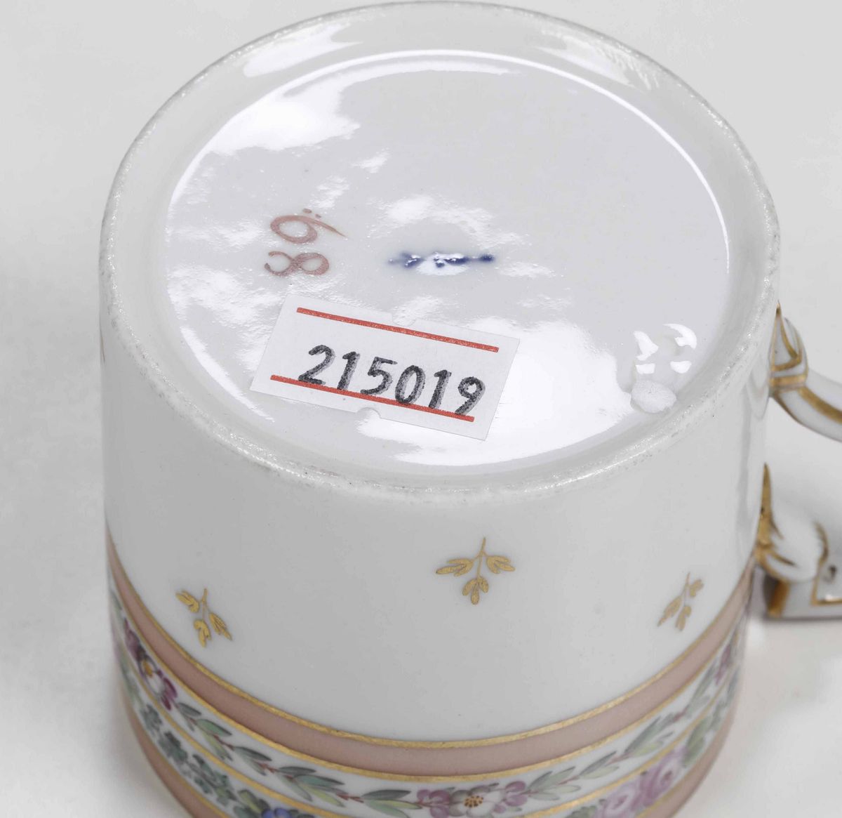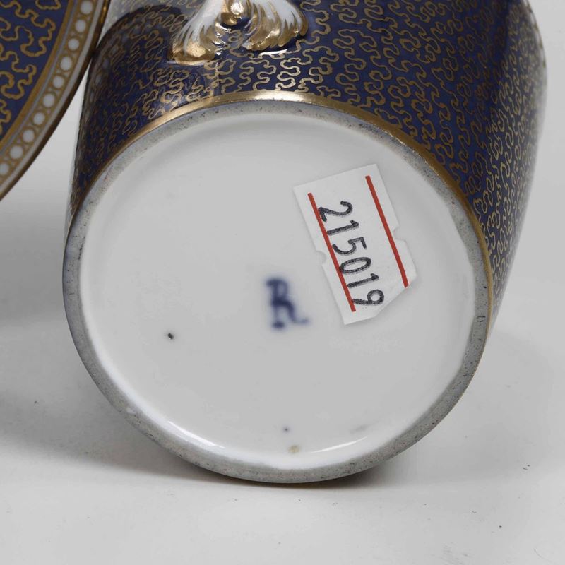 La tazza con il suo piattino dal fondo blu vermiculé in oro proviene da una manifattura della Turingia, probabilmente Rudolstadt, è da datare 1790-1795 circa (per una zuccheriera decorata con il medesimo vermiculè cfr. M.NEWMAN, Die deutschen Porzellan-Manufakturen, Braunschweig 1977, II, fig. 167)