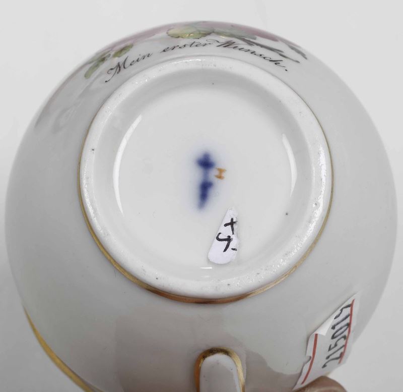 Pure della Manifattura Reale di Berlino, 1800-1810, è l’ultima tazza, modello detto “Campanerform”, dipinta con due rami fioriti con rose e la scritta “Mein erster Wunsch” ossia “Il mio primo desiderio”; il piattino è una sostituzione in porcellana di Parigi della metà del XIX secolo.